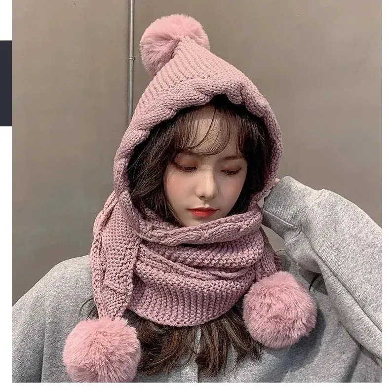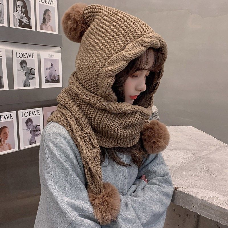 帽子 韓国ファッション 毛糸ハット ニット帽子 スカーフ マフラー一体 日系 厚手 ウォーム 小顔効果 かわいい 毛玉の耳当て キュート ゆったり 2025 新作 百掛け