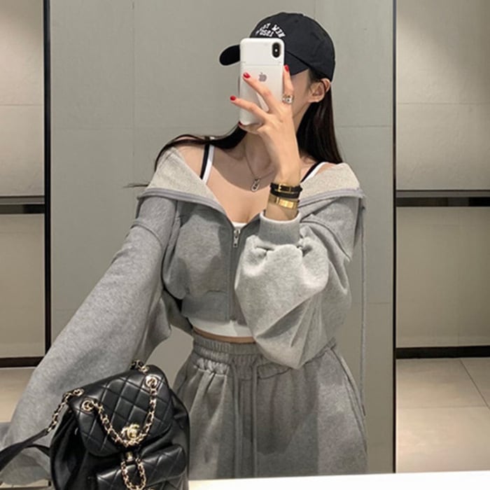 2026 春 スウェット セットアップ 韓国ファッション フード付き 長袖 セットアップ ショート丈 パーカー ハイウエスト ワイドパンツ カジュアル レディース