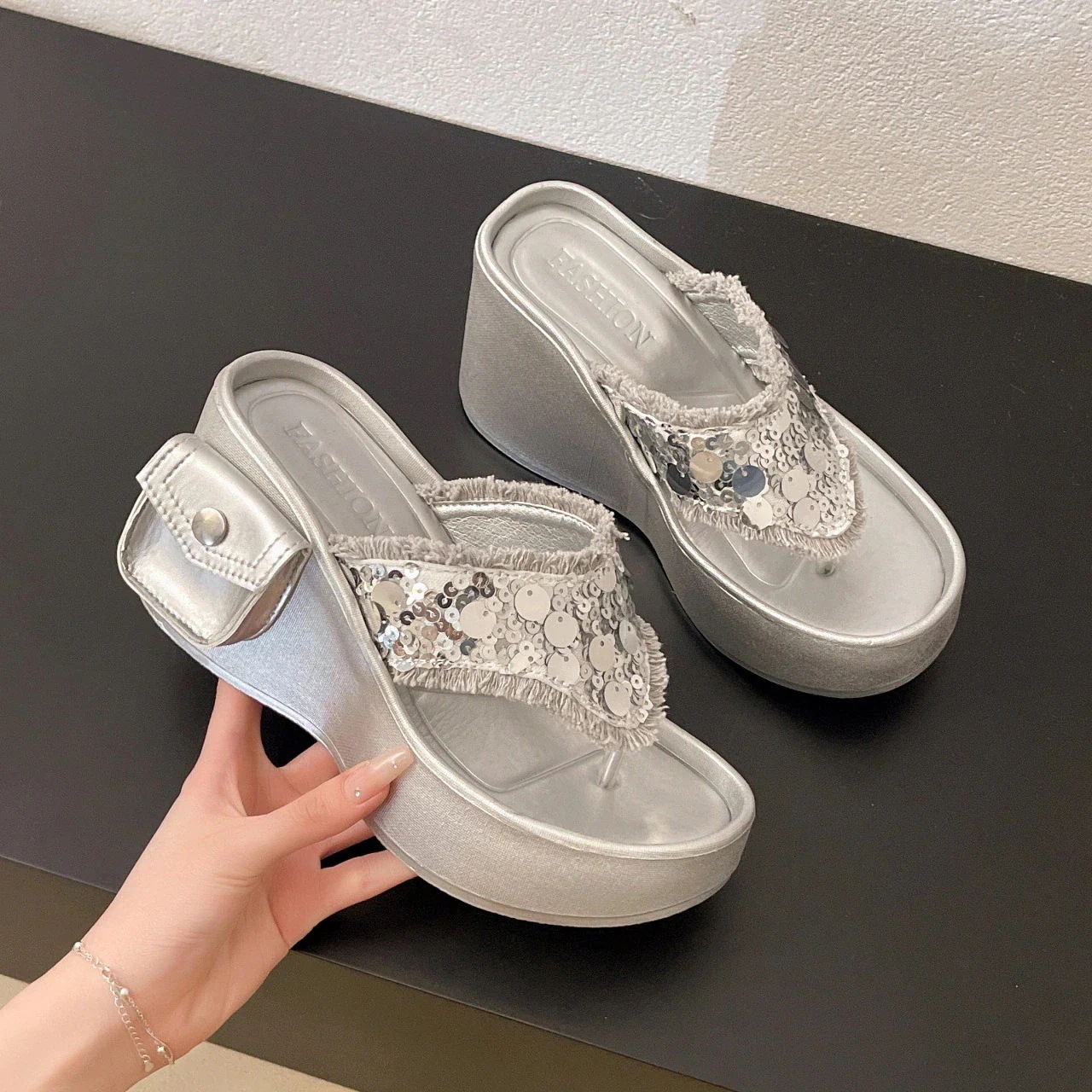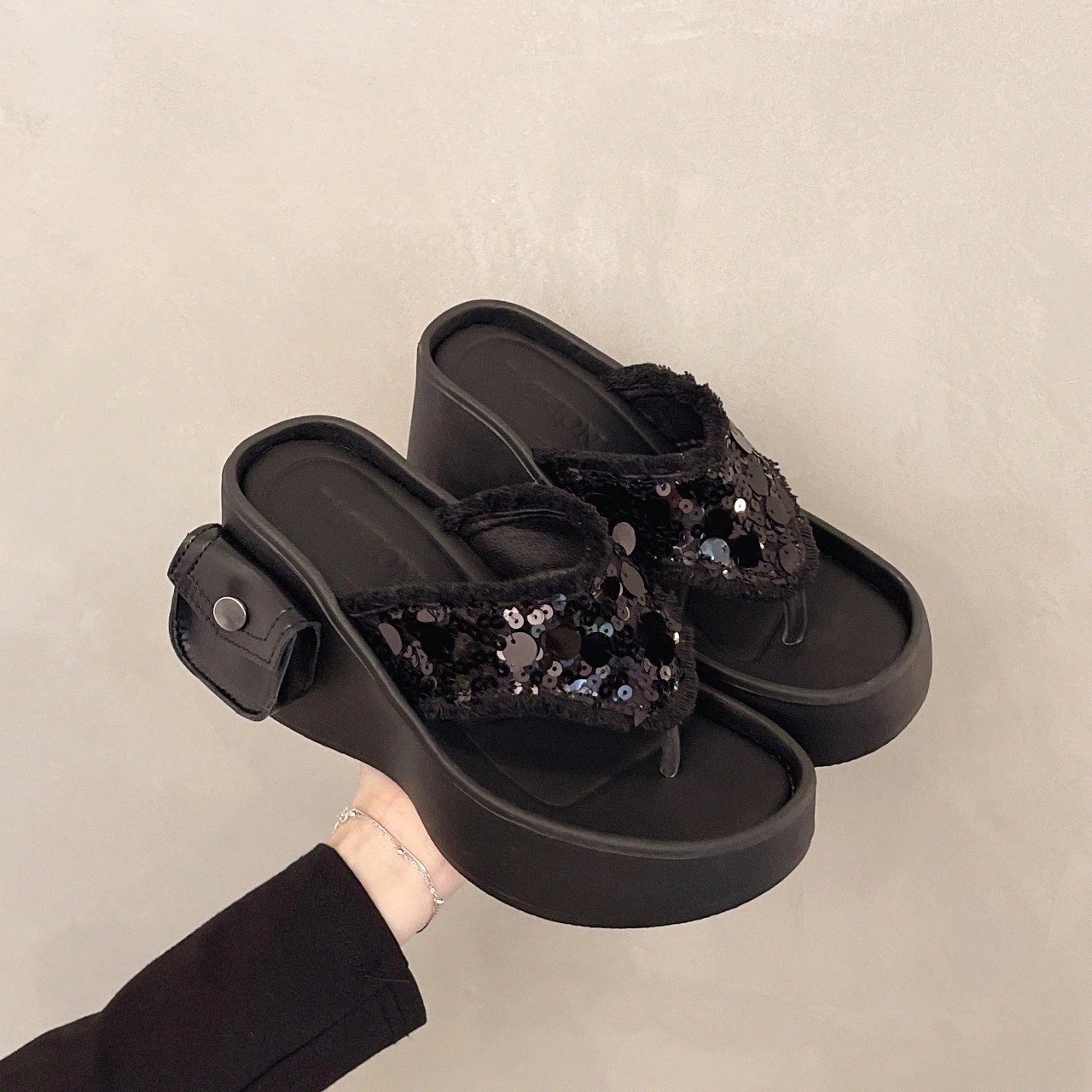 サンダル 厚底サンダル 話題!トングサンダル 春と秋の新しい外部摩耗厚底サンダルスリッパ女性スパンコールニッチ露出つま先サンダル一言ドラッグショー高ヒュー 韓国ファッション