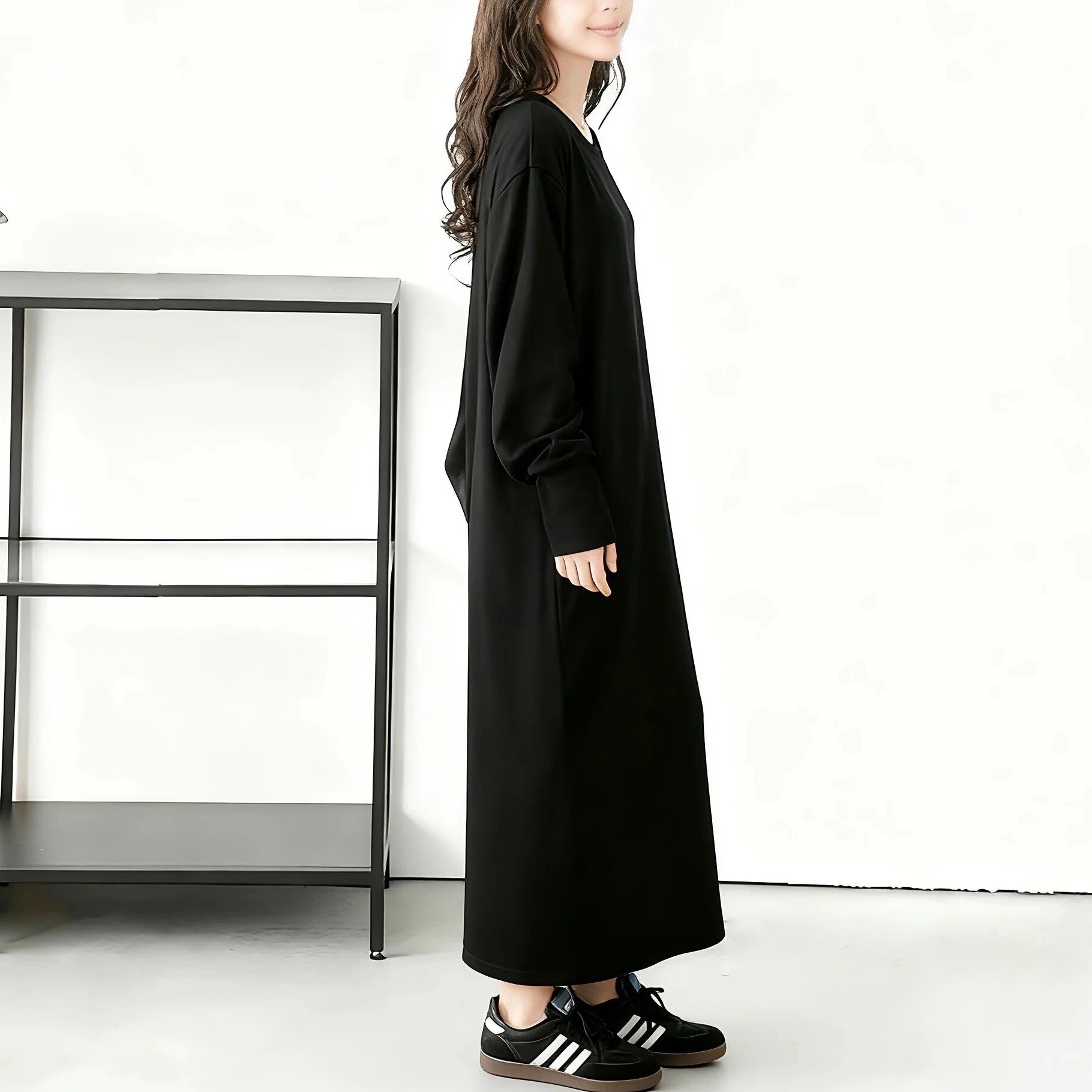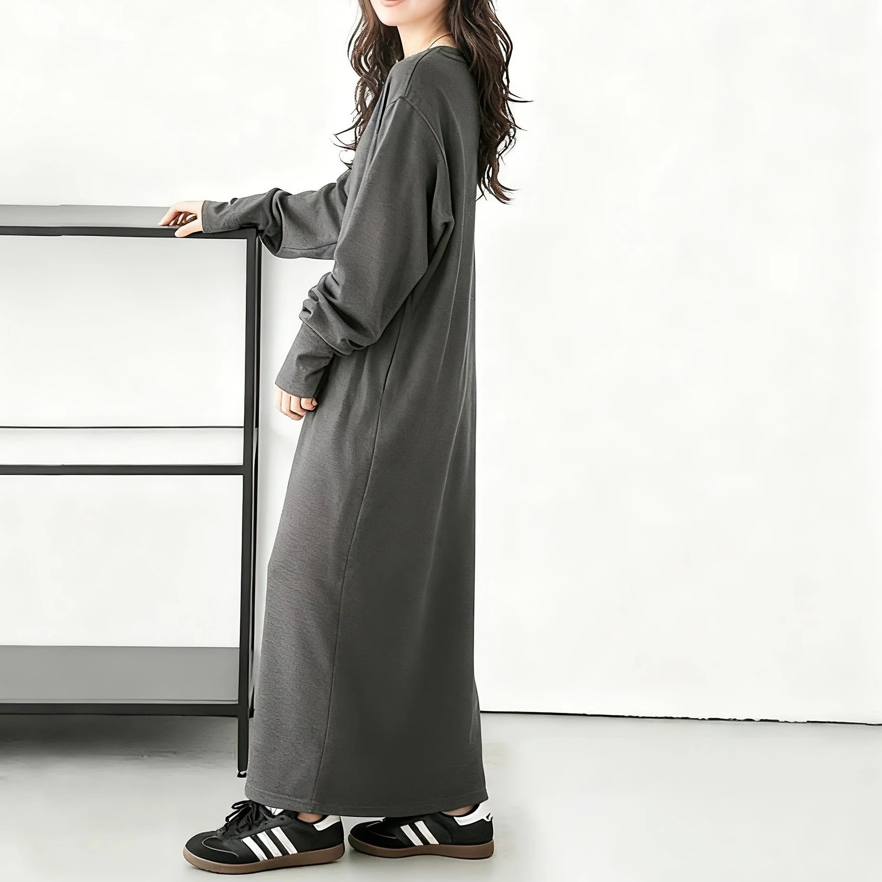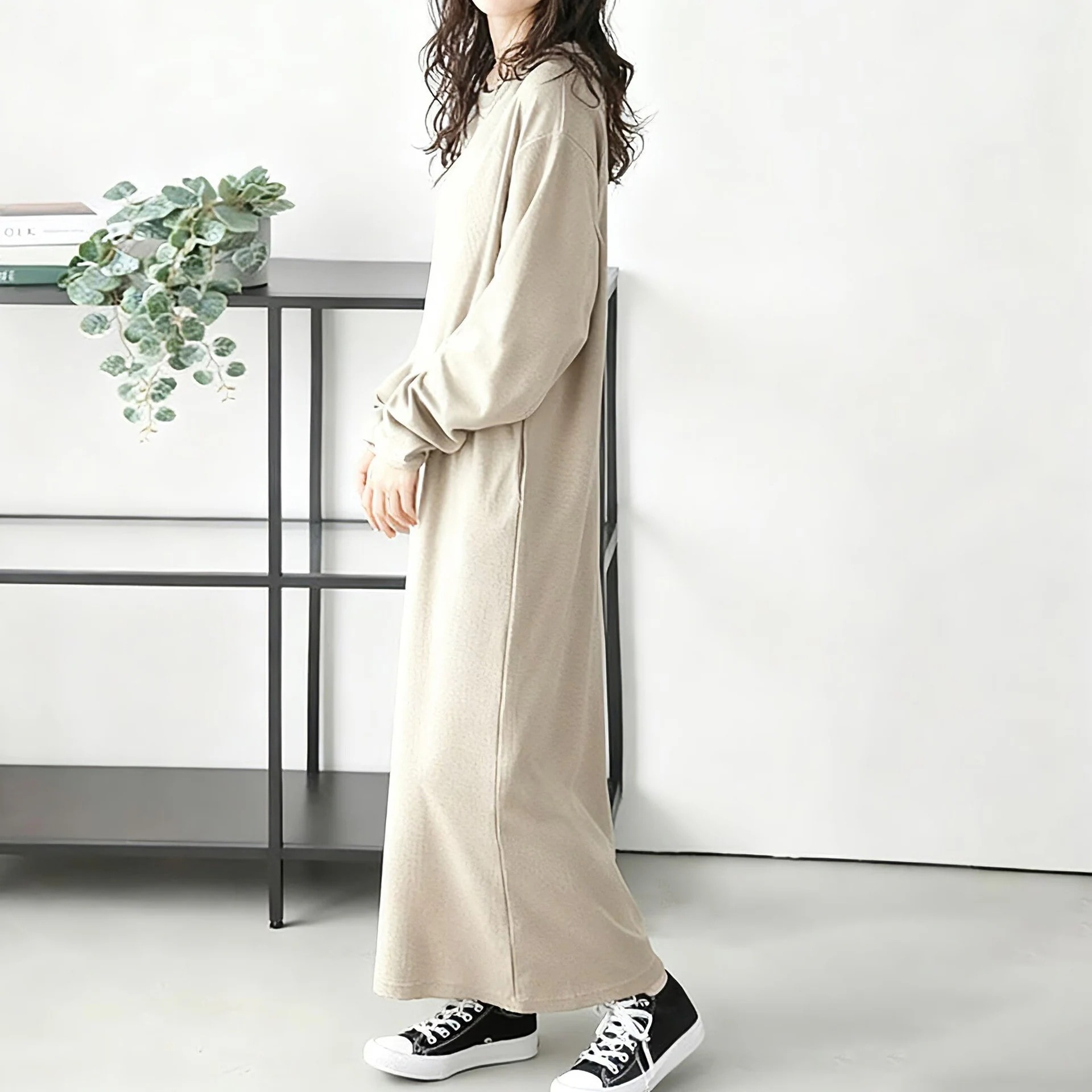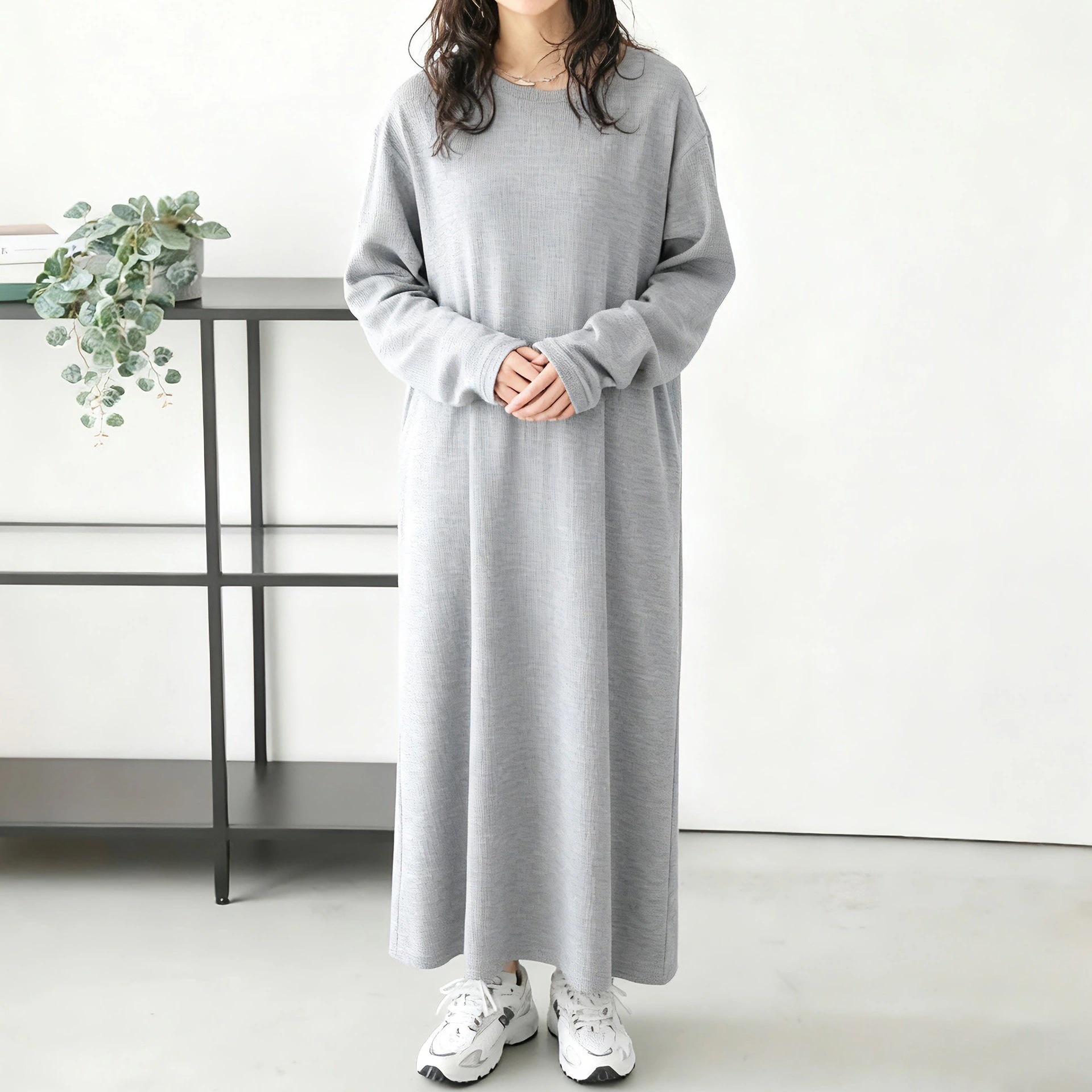 日本レディース秋新作ワッフル編みワンピース ゆったり無地ラウンドネック万能スリムロングスリーブドレス ロング丈・長袖