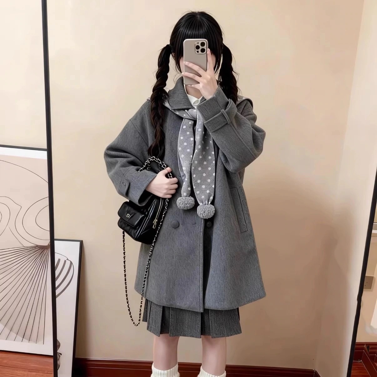 【3日出荷】スカーフ付き韓国風グレーウール 冬 低身長向けアウター コート 春服 レディース