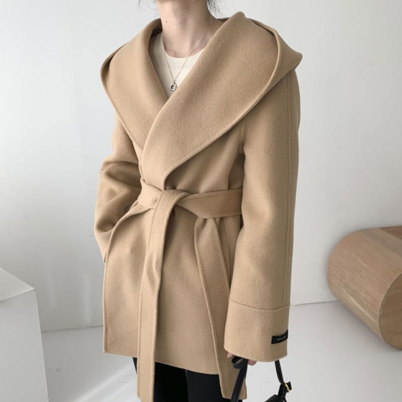 【3日出荷】秋 エレガントフードポケット付きジャケット ドローウエストシェイプ スリム無地ロングスリーブウールアウター コート 春服 レディース