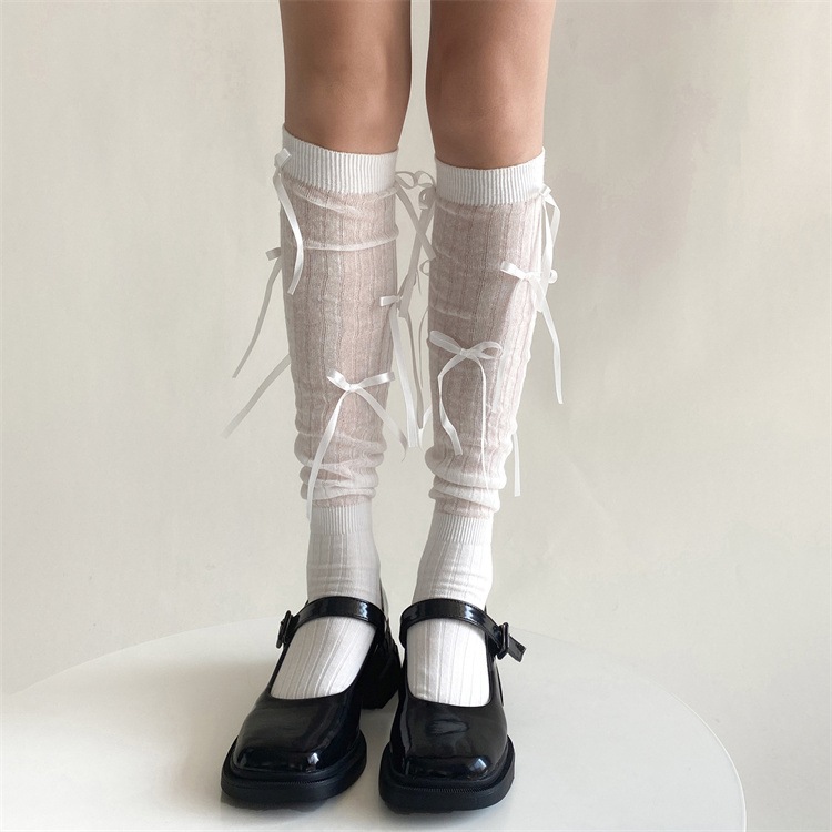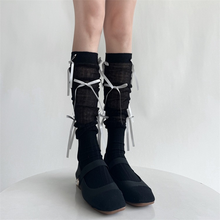 韓国ファッション バレエ風 デザインセンス リボン 蝶ネクタイ おしゃれな ニーソックス 2024春秋 ステッチング 学院風 スタックソックス 甘い スネア靴下 摩擦防止