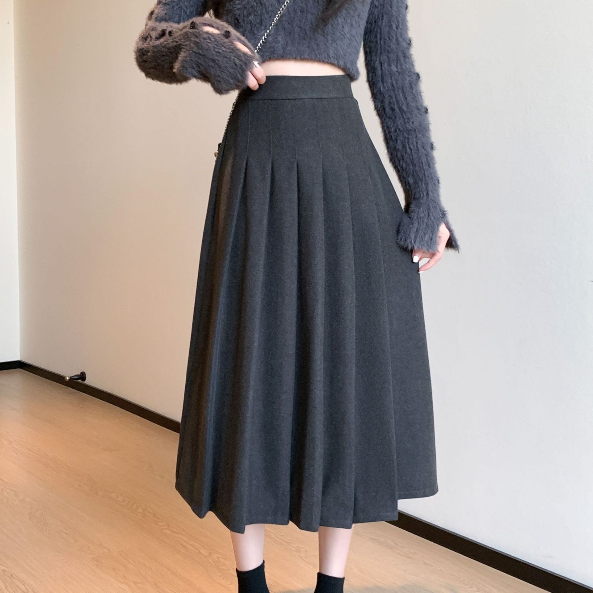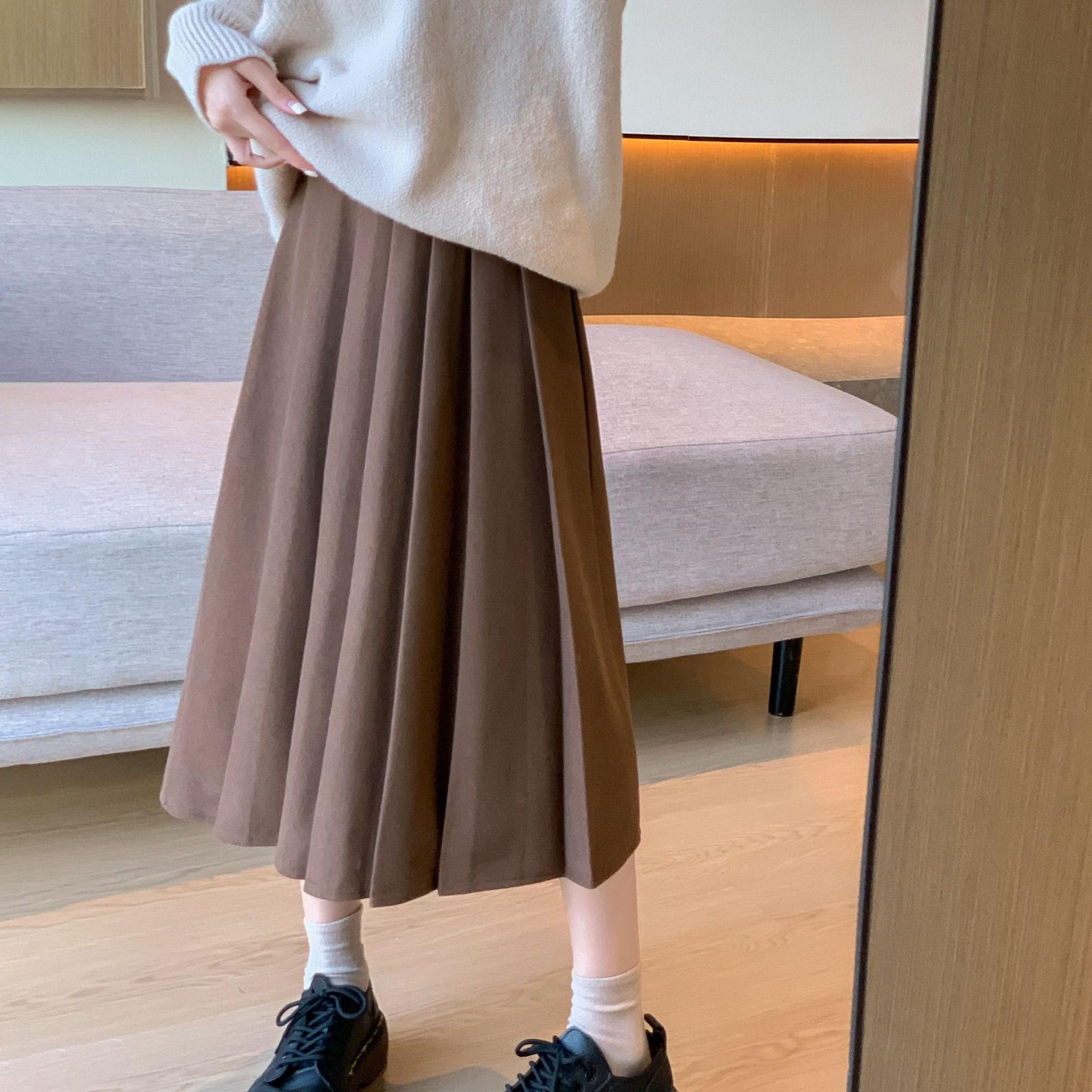 半身裙女性秋冬新作厚手ウールプリーツスカート ハイウエスト細身ゆったり大サイズゴム入りミディ丈スカート ロングスカート