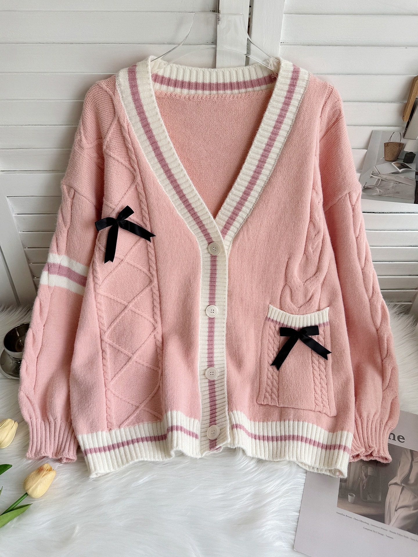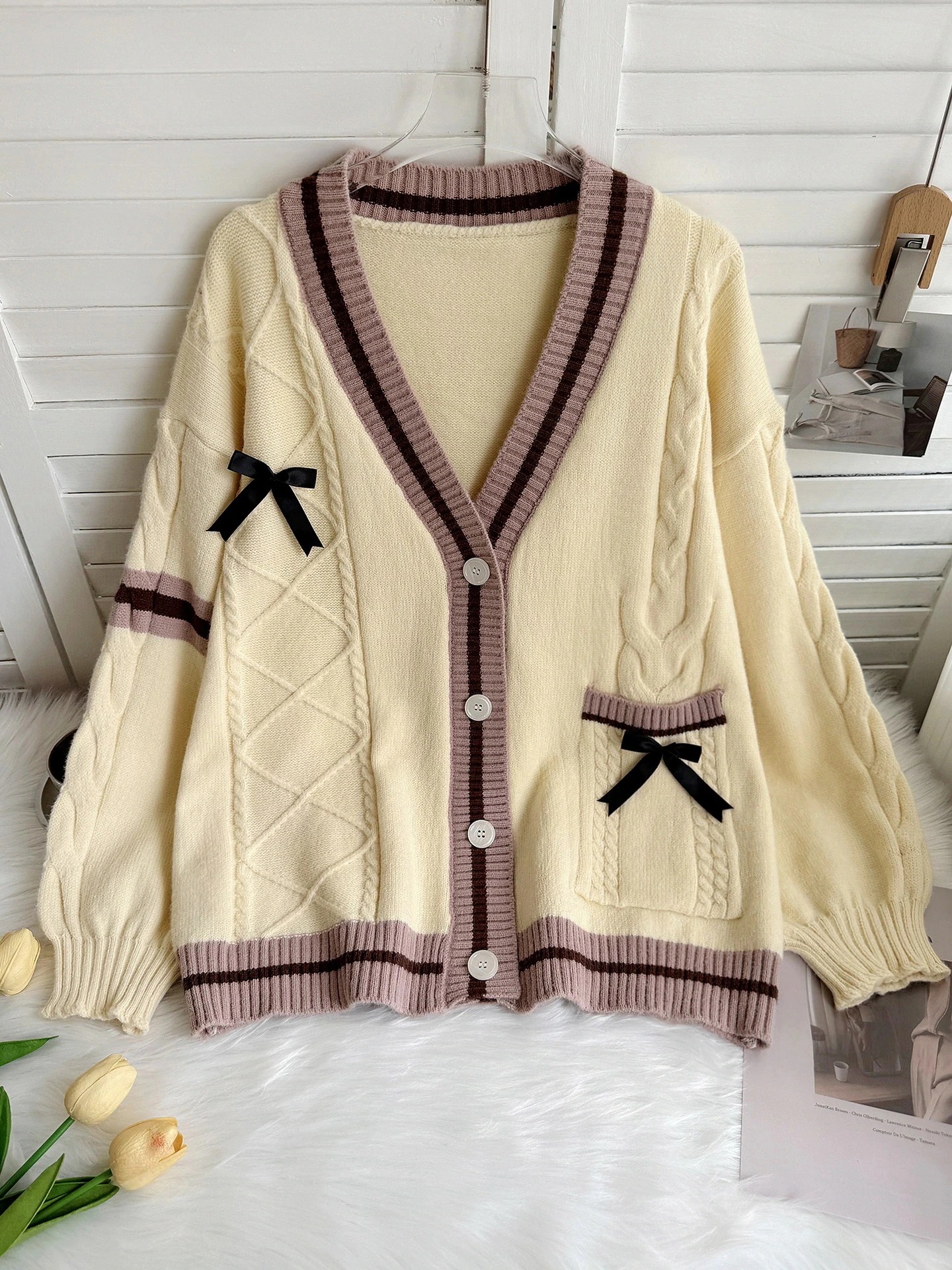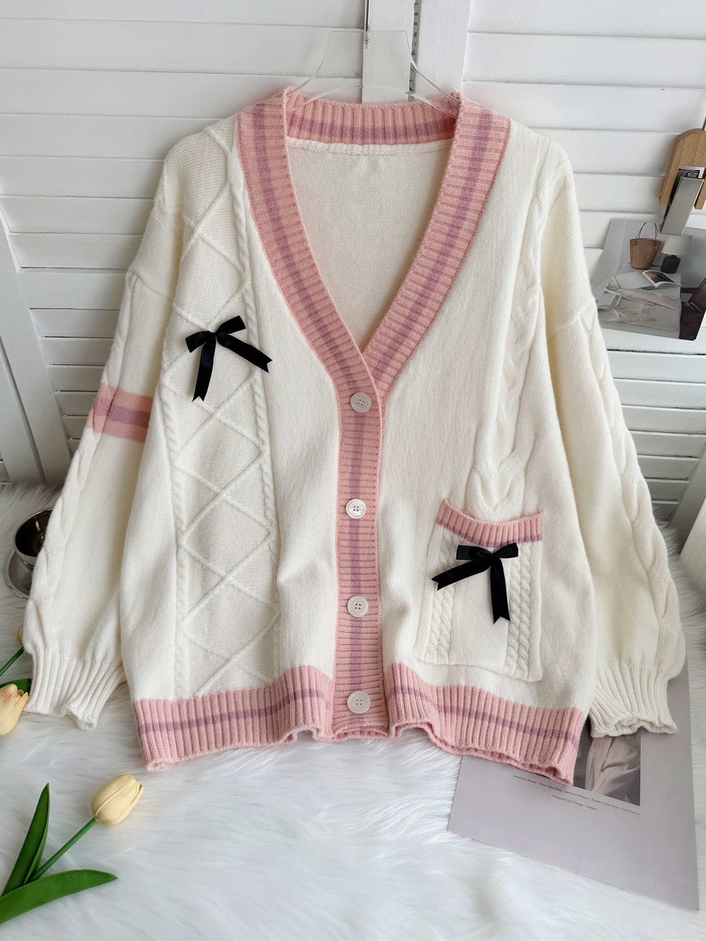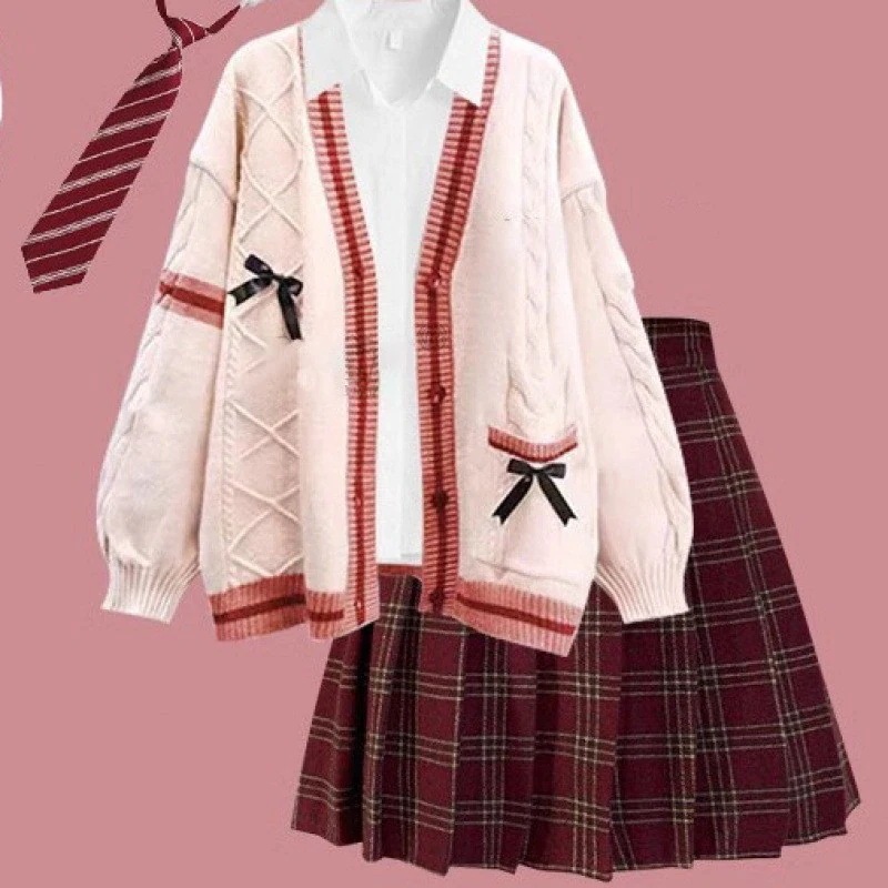 人气新作韓国ファッション カーディガン 新作スクール風ビッグサイズニットカーディガン甘めリボンJKセーターアウター
