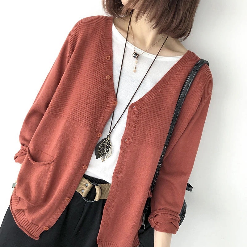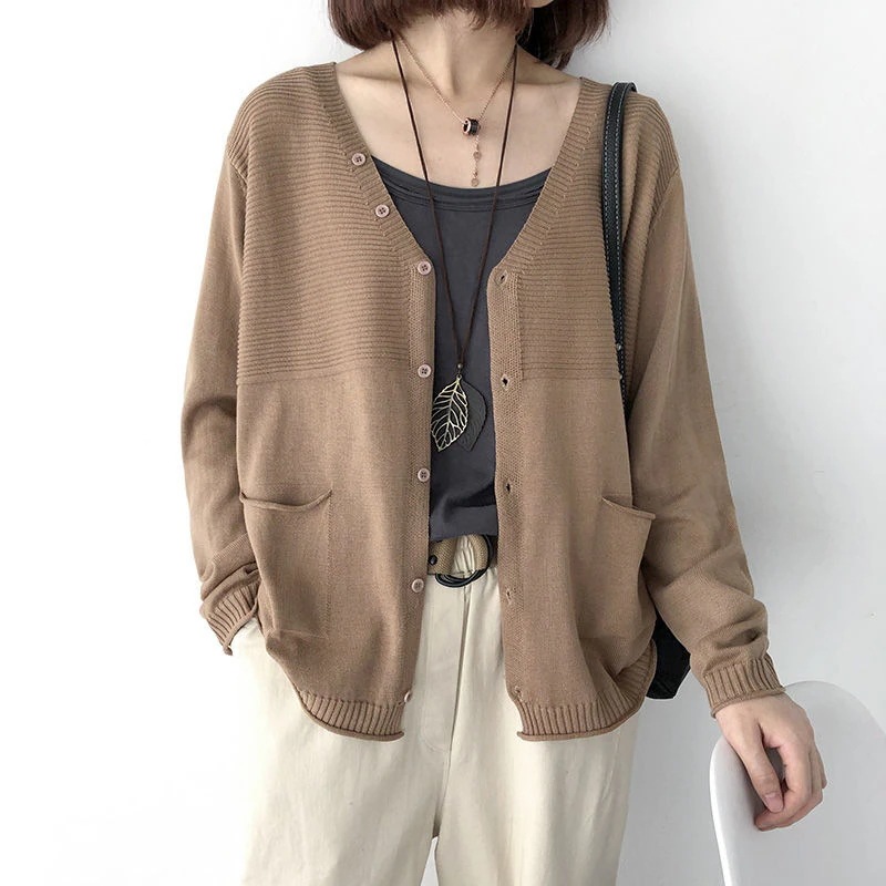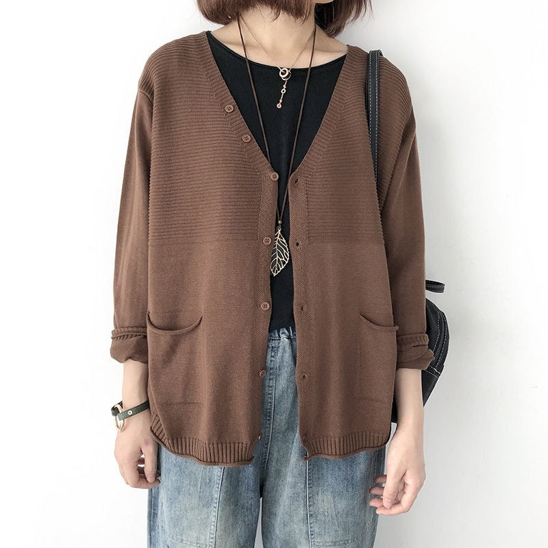 人气新作韓国ファッション カーディガン ゆったりVネック長袖ニットカーディガントップス 薄手セーター女性用アウター