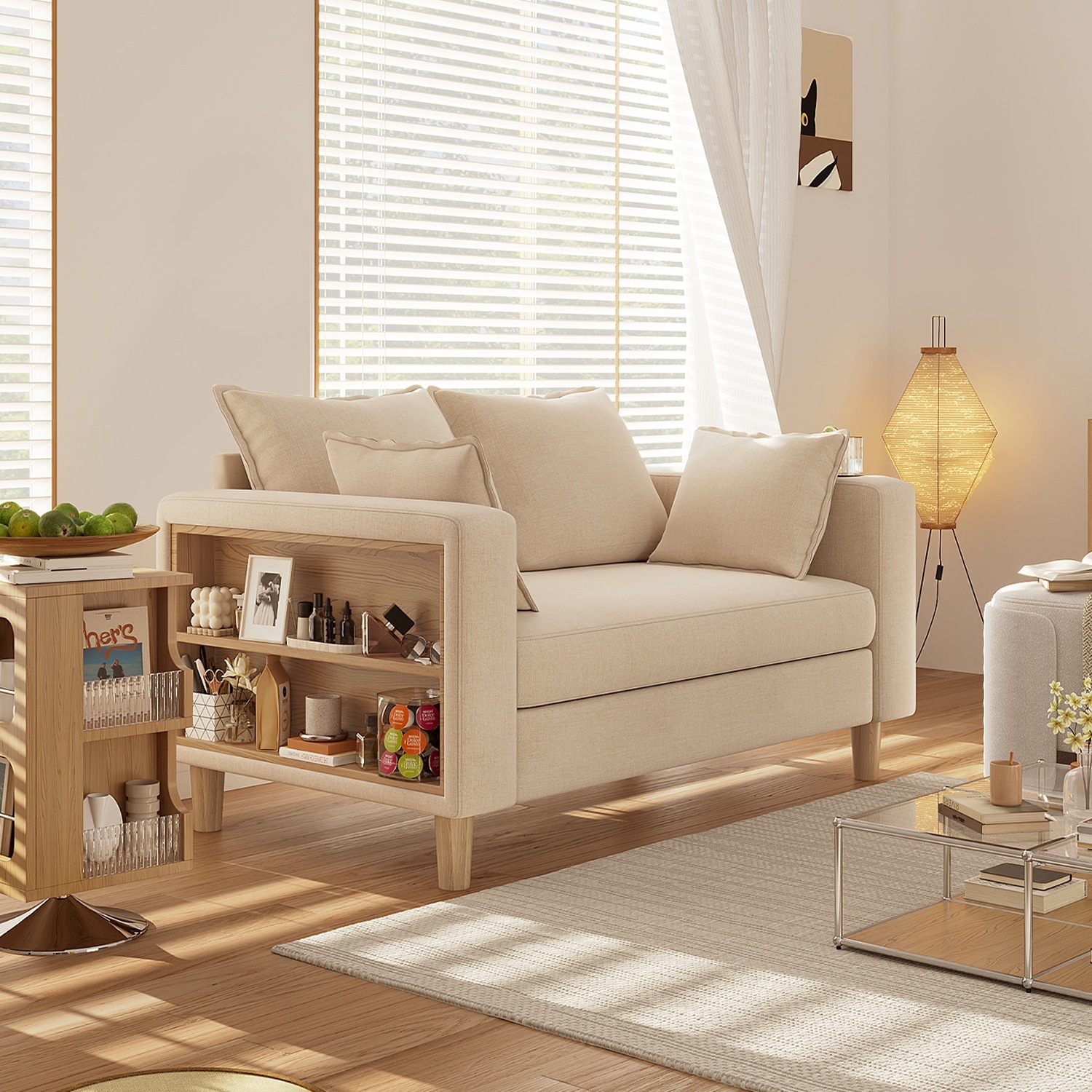 送料無料194二人掛け 収納ソファー 多機能アームレスト(カップホルダー付) 幅123cm ファブリック 高反発 ソファ 極上座り心地 洗えるカバー 天然木脚 簡単組立 省スペース