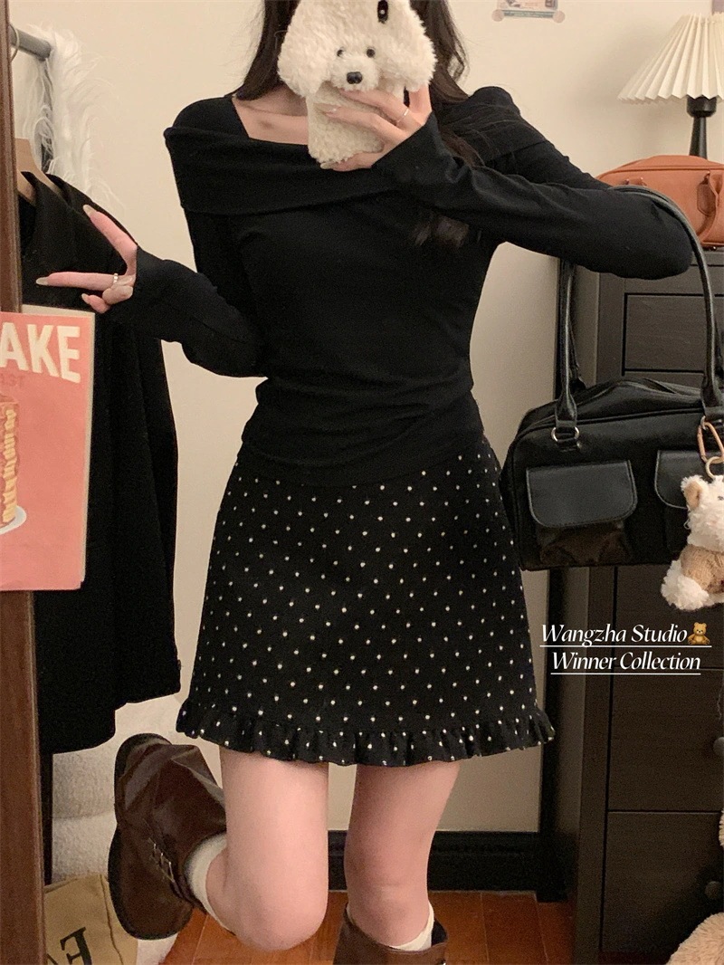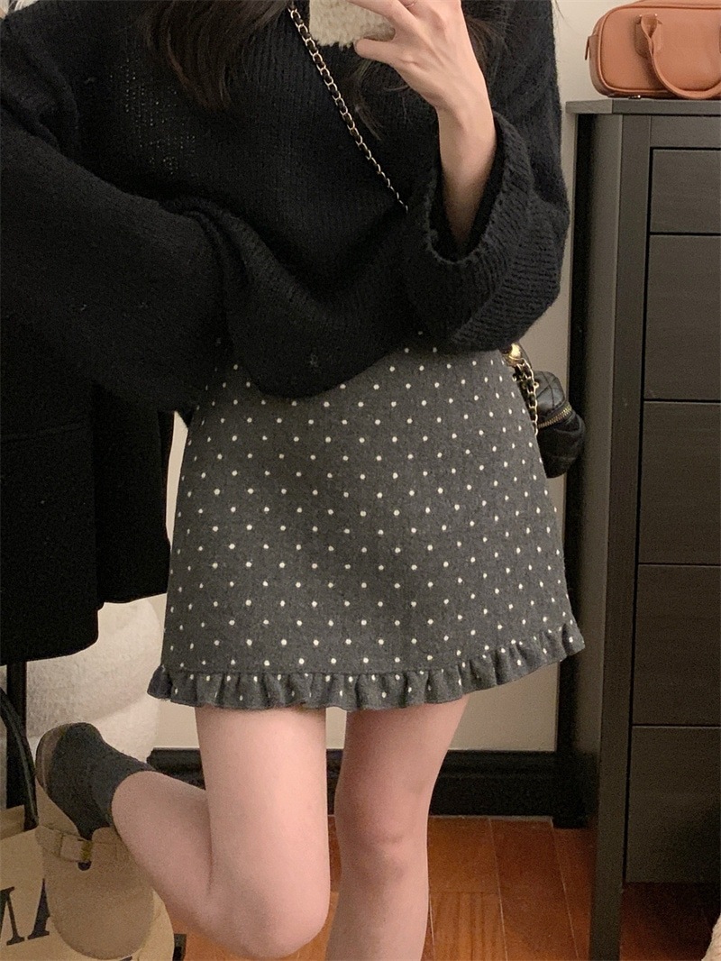 ドット柄ウールスカート2026秋冬新作 おしゃれな韓国風ガーリー感フリル付きパッチワークミニスカート