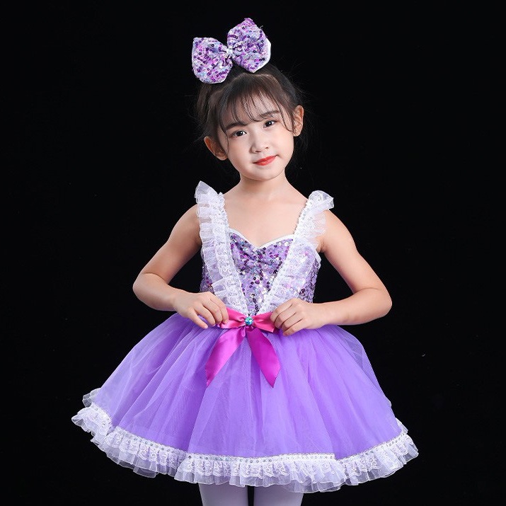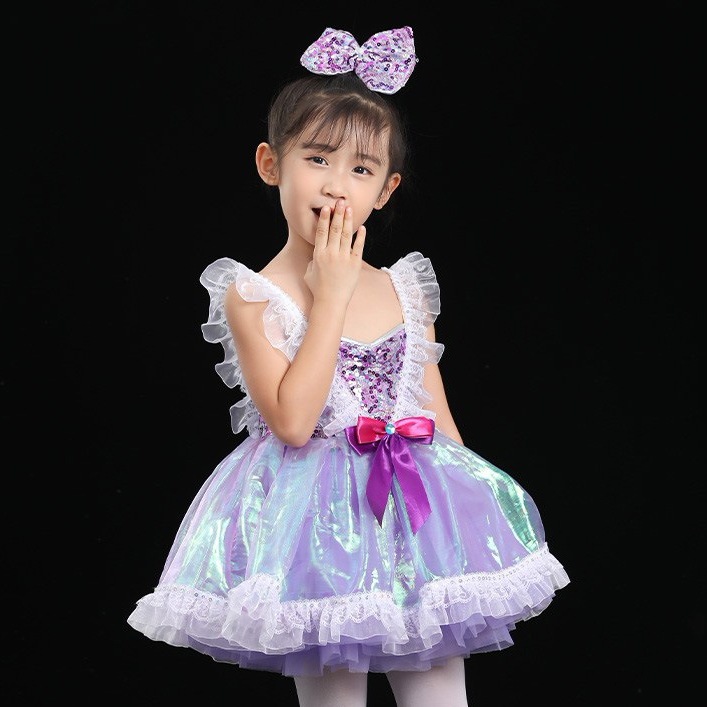 コストパフォーマンスチアダンス 衣装 女の子 ダンスワンピース キッズダンス パープル ワンピース スパンコール チュールスカート 袖なし チアガール キラキラ 韓国 ダンス衣装 可愛い 子供 ジュ