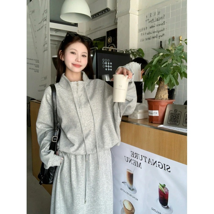 ラフなカジュアルセットアップ レディース ゆったりグレースタンドカラードローストリングスウェット 秋用ハイウエストスリットスカート2点セットアップ