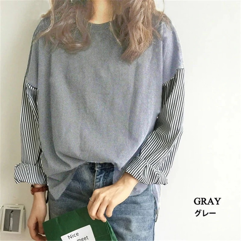 カットソー レディース シャツ 薄手 袖 ストライプ トップス 切り替え 異素材 フリーサイズ 30