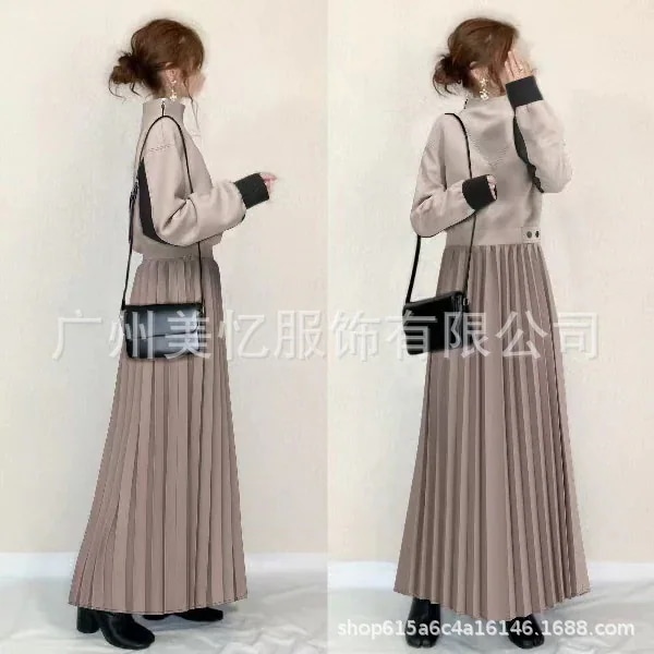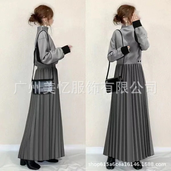 2025年春夏の人気商品 ジッパー付きウエスト絞り ボタン付きプリーツロングワンピース・長袖