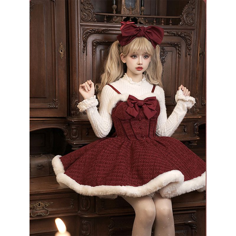 【3日以内出荷】2026 秋 冬 韓国ファッション サンタコス クリスマス セット ロリータ レッド 蝶ネクタイ ポンチョ ジャケット キャミソールドレス コスチューム2026 秋 冬 韓国ファッショ