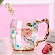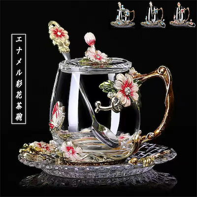 耐熱 ガラスティーカップ&ソーサー&蓋&スプーン 400ml ティーカップ エナメル彩花水カップ茶わん茶碗プレゼント 贈り物 誕生日 お祝いガラス 記念日