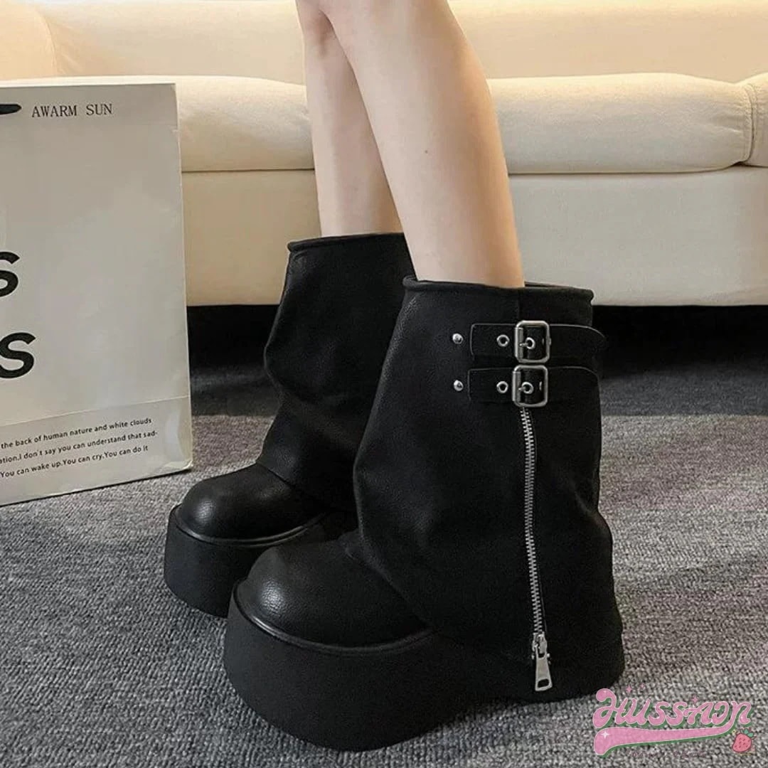 ベルト付き ブーツ 靴 ミドルブーツ ジップシューズ PU プラットフォーム 脚長 色っぽ 女っぽ カジュアル きれいめ 人っぽ 上品 フィット ゆったり フェミニン カジュアル オシャか