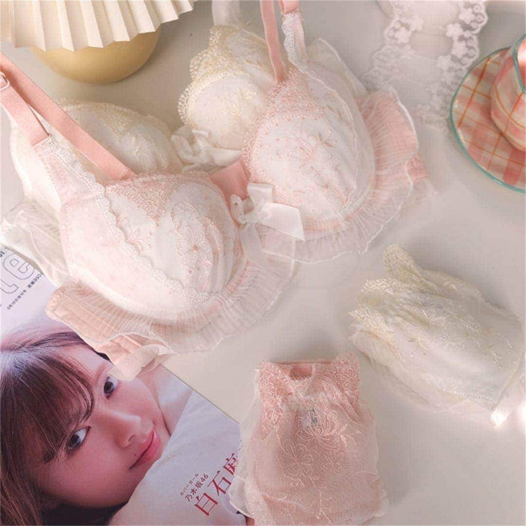短納期 AEカップ可愛い レース 刺繍 ホワイト ピンク ワイヤー入り ブラ&ショーツセット