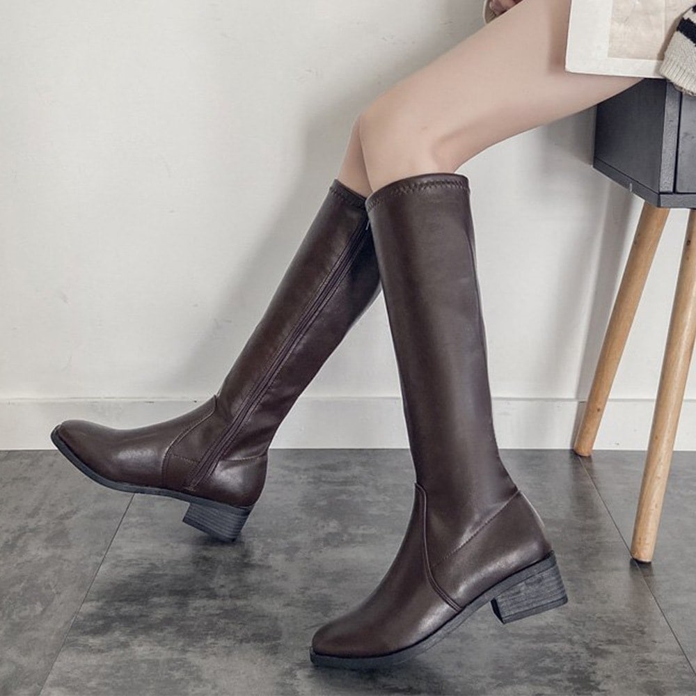 現品/優良商品ニーハイブーツ レディース ロング丈 スクエアトゥ ローヒール 合皮 レザー調 春秋冬 美脚 人