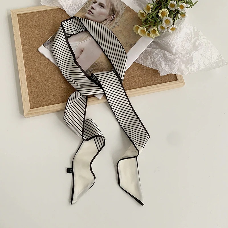 白黒ストライプのシルクスカーフ 長尺で高級感 春夏に万能な斜めリボン結び ハンドバッグ用スカーフ ヘアバンド ヘアスカーフ ウエストベルト シルクスカーフ