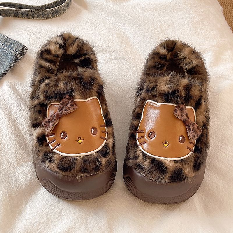 おしゃれなヒョウ柄猫のモコモコスリッパ冬の新作厚底カジュアル靴滑り止めバッグとガウチョのかわいい家用綿スリッパ