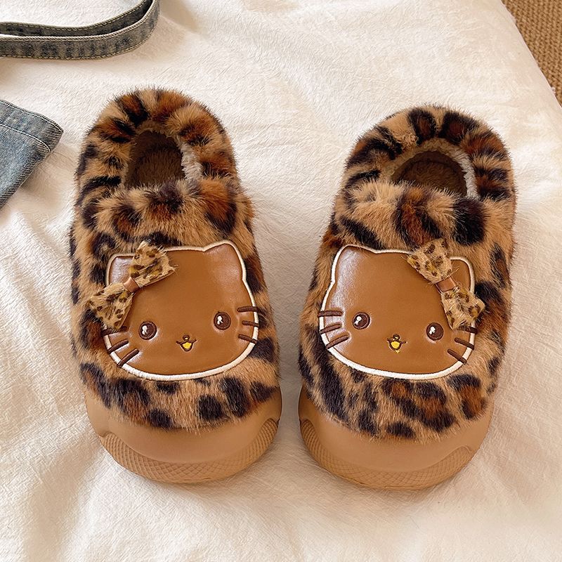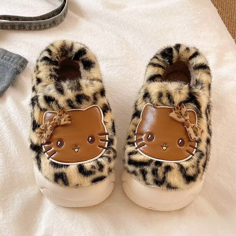 おしゃれなヒョウ柄猫のモコモコスリッパ冬