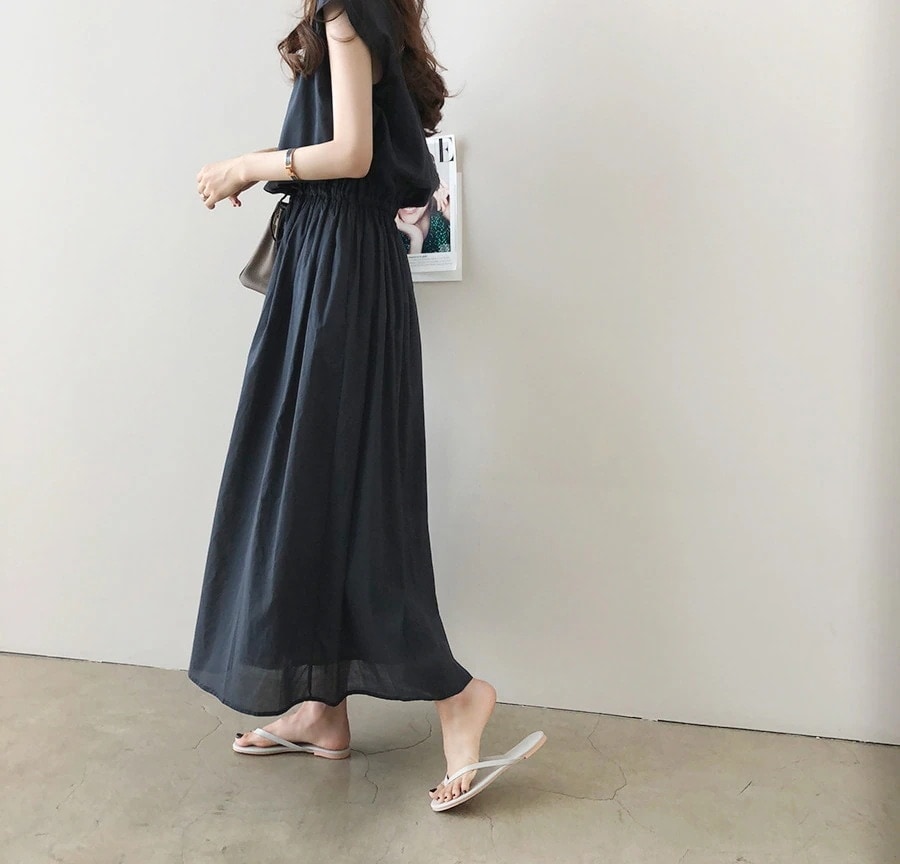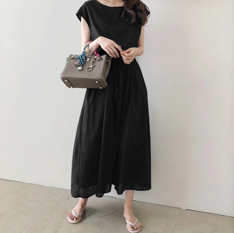 春夏ベストセラー新品 韓国ファッション 綿 100% 生地 裏地付き ルーズ文芸風 綿麻素材 大きいサイズ対応 半袖 ロング丈 フレアスカート ワンピース