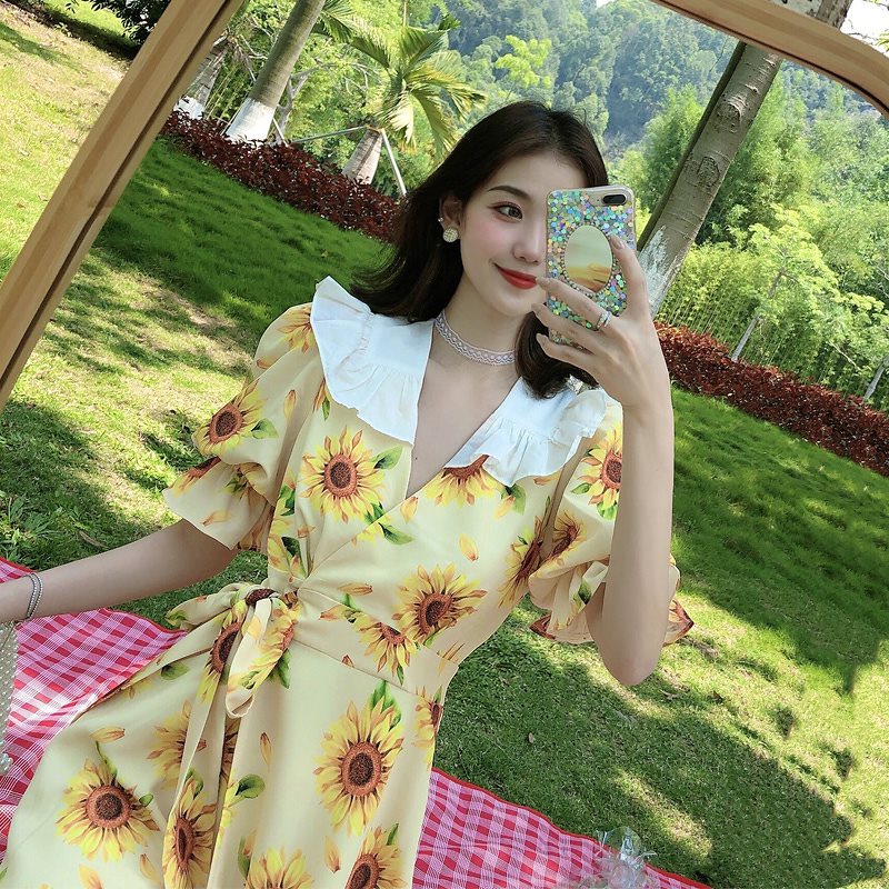 子供の襟の黄色の小花のワンピースの新型ははらはらします雅風超仙のスカートは腰のヒマワリの太陽の花のスカートを収めます