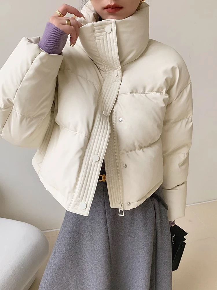 の女性用アメリカンpuレザーショートハイプロファイルダウンジャケット厚みのあるスタンドカラーホワイトダックダウンノーウォッシュパンコートファッションジャケット