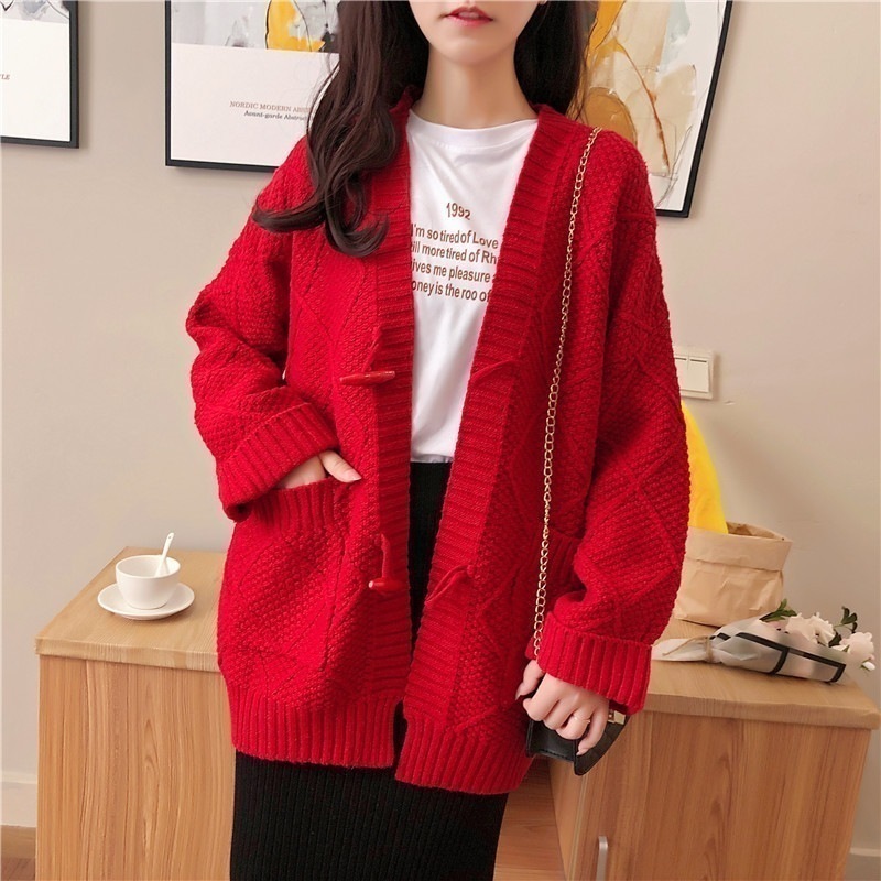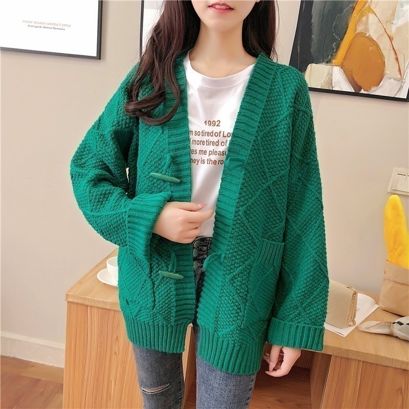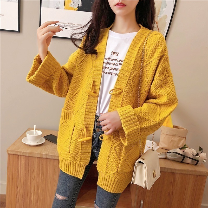 【3日出荷】 韓国風 太糸 ホーンボタン カーディガン Vネック アラン編み 春服 レディース 長袖tシャツ レディース 母の日