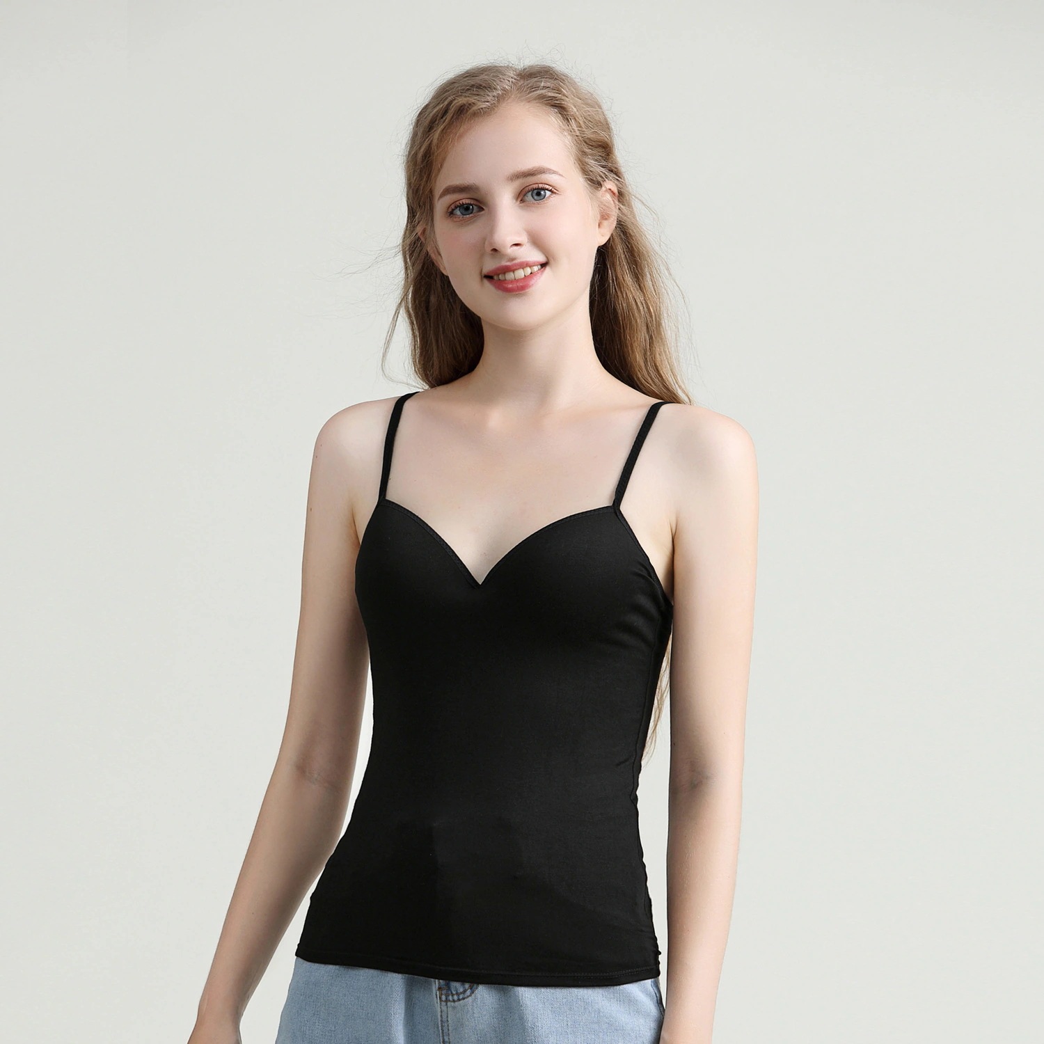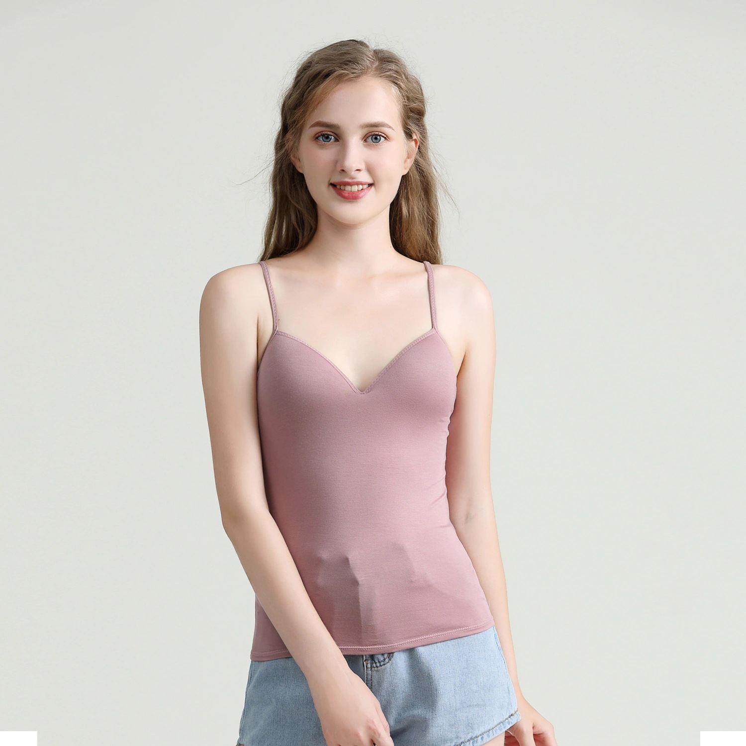 韓国風スリムモダールタンクトップ ノースリーブレディースタンクトップVネックパッド付きワイヤーレスブラタンクトップ