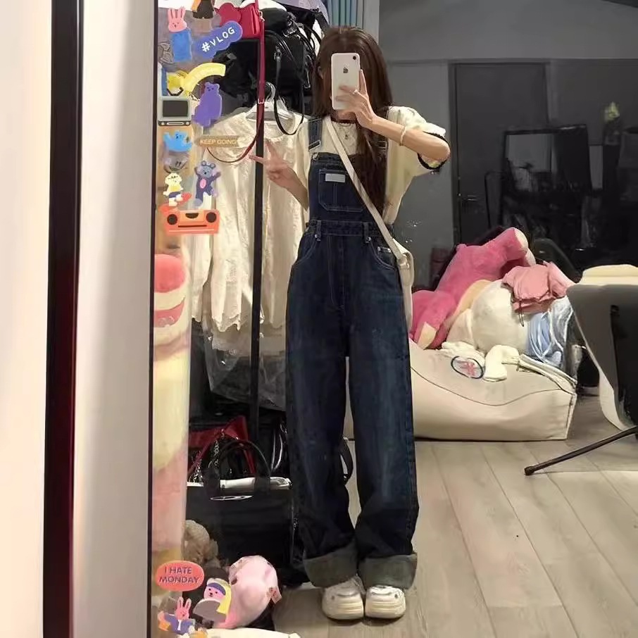 デザインセンスのある女性用のレトロなハイウエストデニムオーバーオールニッチなワイドレッグルーズストレートレッグスリムなフロアレングスパンツ
