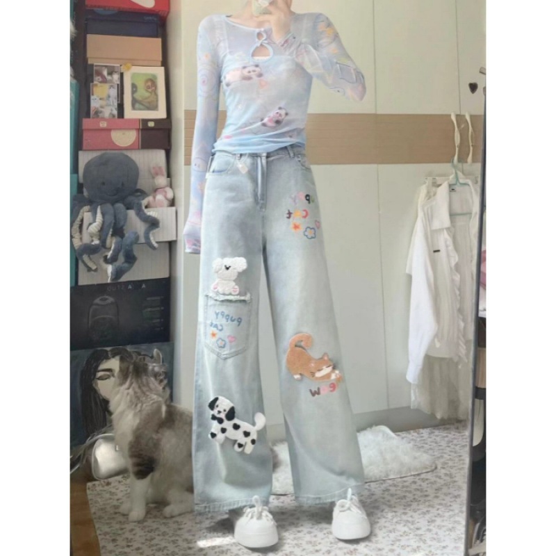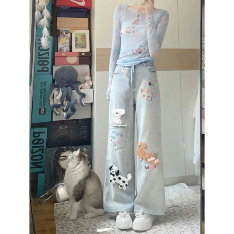 男の子子供の楽しい漫画パッチワイドレッグジーンズ女性の秋のデザインハイウエストルーズ痩身フロアレングスパンツ
