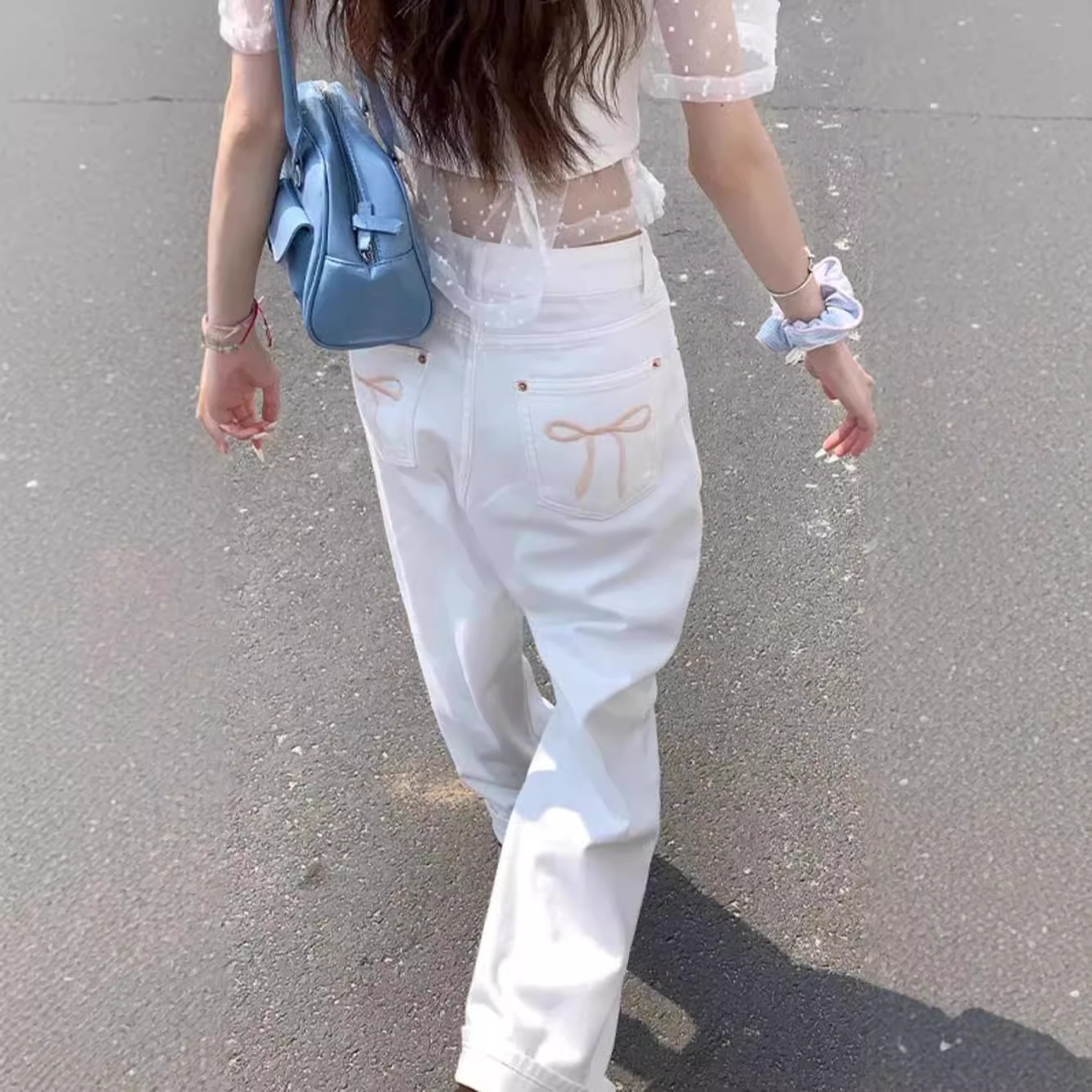小さなリボン刺繍白ストレートジーンズ女性の夏の新しいハイウエストルーズ痩身ワイドレッグパンツ