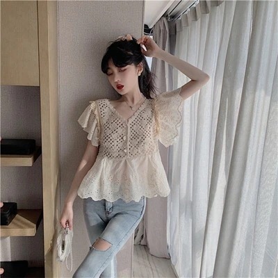 最終プライス早い者勝ち フックフラワー レース ししゅう フリル ファブリック Vネック ホロー トップス