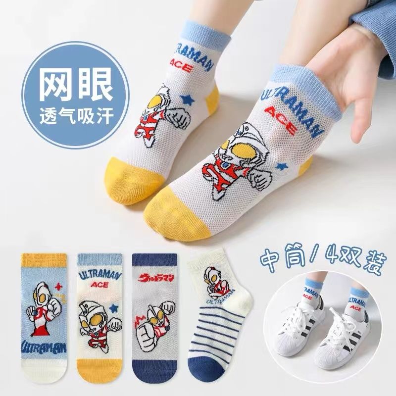【3日出荷】子供の靴下ウルトラマン夏の薄い綿の男の子のネットの目の中の子供の春秋漫画の通気性の中筒のソックス