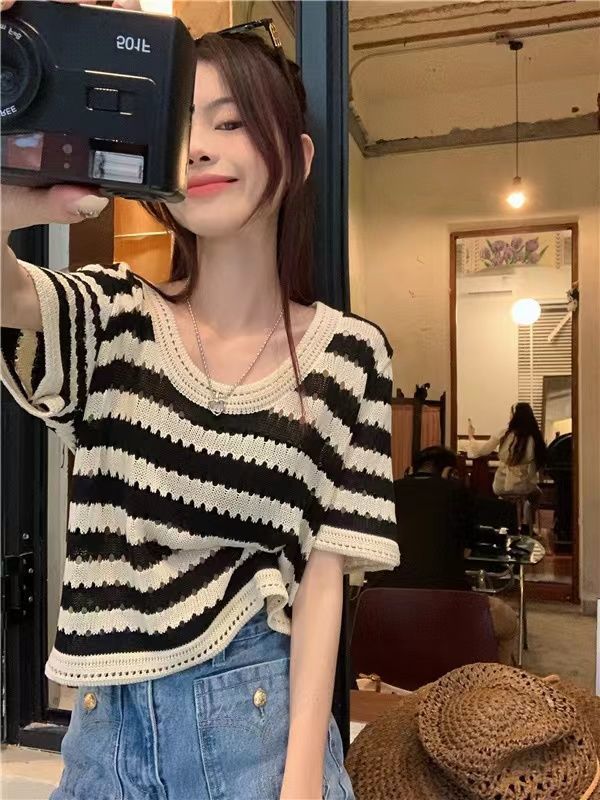 【3日出荷】夏 ins ボーダー柄 コントラストカラー ゆったり ショート 着痩せ 百掛け 気質 カジュアル アイスシルク 透かし彫り 半袖 Tシャツ タンクトップ tシャツ 半袖 レディース