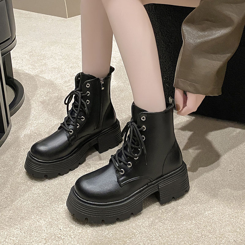 厚底シューズ ブーツ ハイヒールのマーチンブーツ英倫風2024年春秋新型ダッフルヒール機関車ショートブーツ加絨 レディース 韓国ファッション