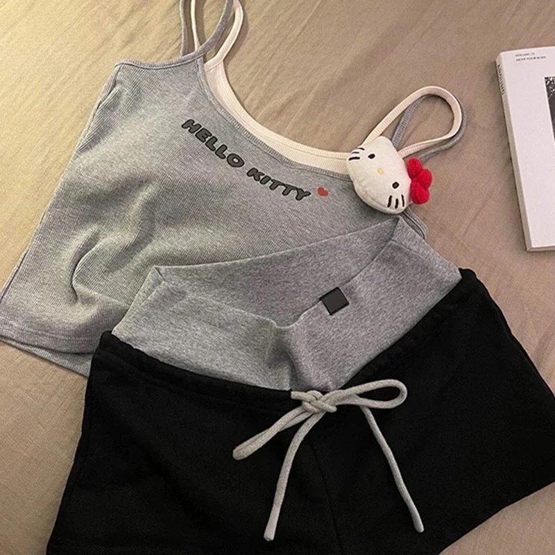 【 3日で出荷 】サンリオハローキティパジャマレディース夏2枚の胸パッド付きパジャマ女ハローキティ人形ギャルベスト純欲風バイカラーパンツスーツ