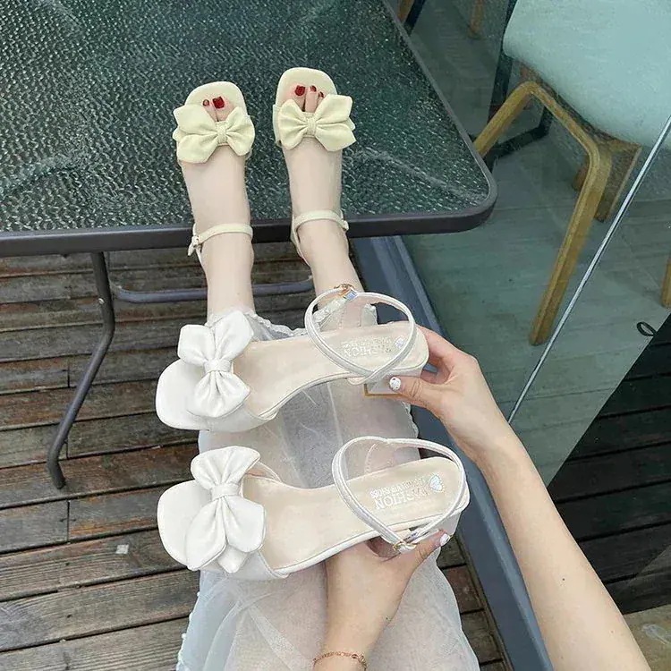 甘皮のハイヒール女性2025年ファッション百合リボン快適一文字太ヒールサンダル女性