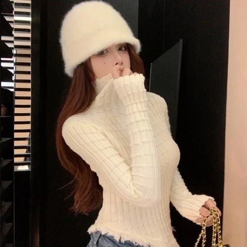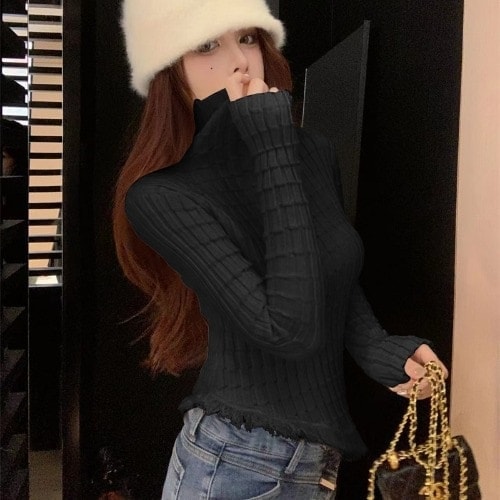 ベーシックニット ロングスリーブトップス 初秋の優しい柔らかな風ニットシックなきれいなジャンパー女性デザインセンス不規則なハイネックフリンジトップス