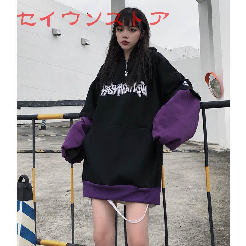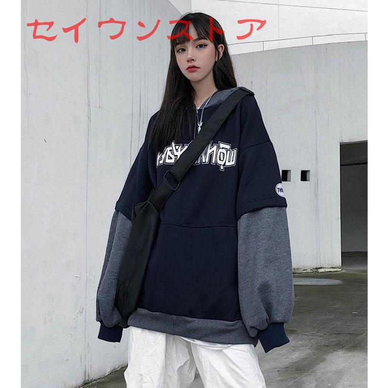 パーカー 裏起毛 レイヤード風 英字 フロントポケット ゆったり 保温防寒 フード かわいい カジュアルウエア レディース トップス