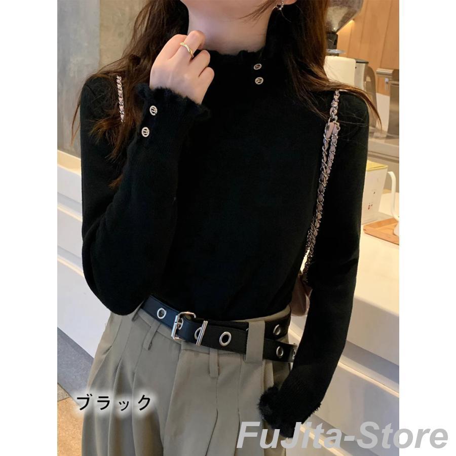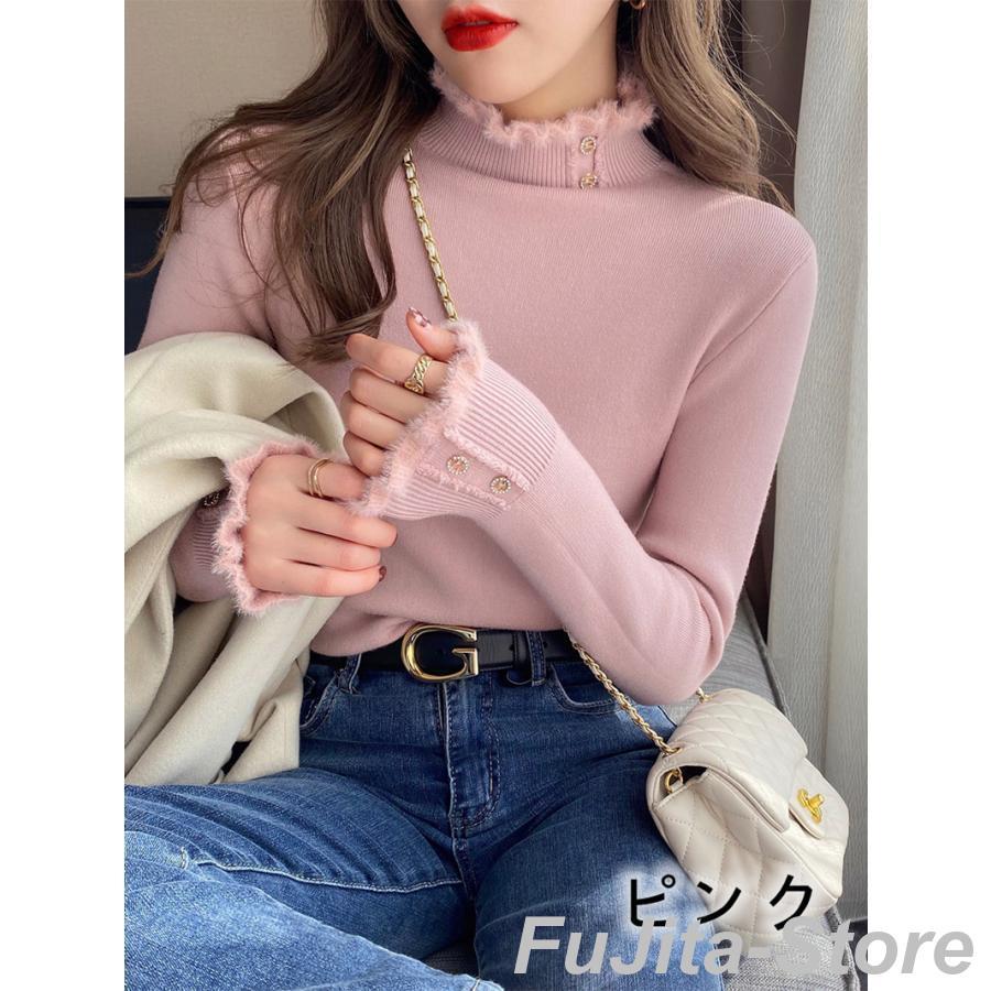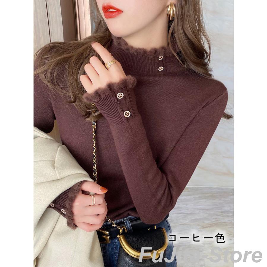 ニットセーター 裏起毛 レディース ハイネックネック シャギーニット厚手 ハイネック 裏ファー ボタン飾り インナー 保温 防寒 蓄熱