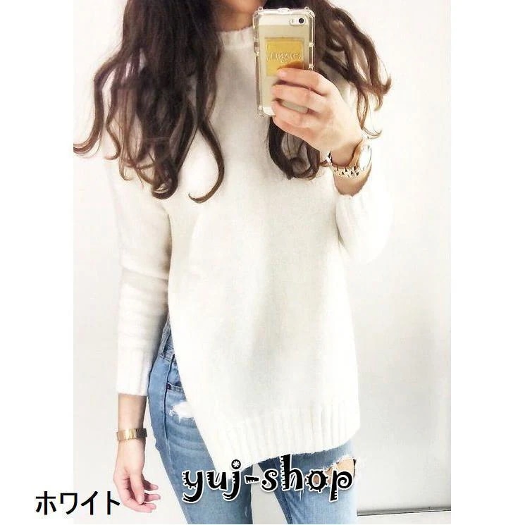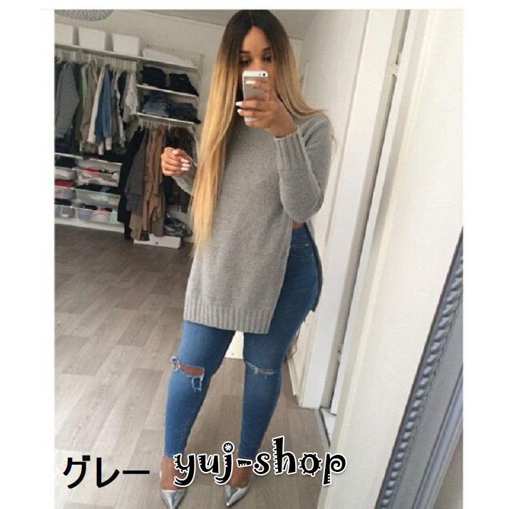 セーター ニット 長袖 ロング ラウンドネック クルーネック 丸襟 レディースファッション サイドスリット ホワイト グレー