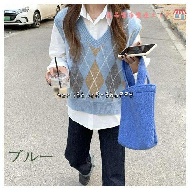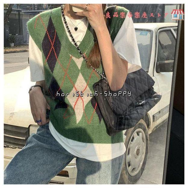 ニットベスト Vネック 菱形柄 トップス アウター おしゃれ かわいい ゆったり レイヤード カジュアル セーター 上着 厚手 レトロ 可愛い Vネック リラックス プ