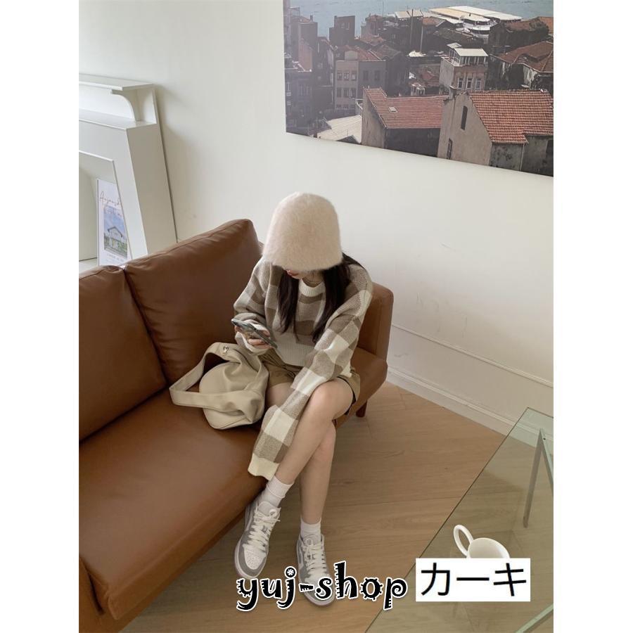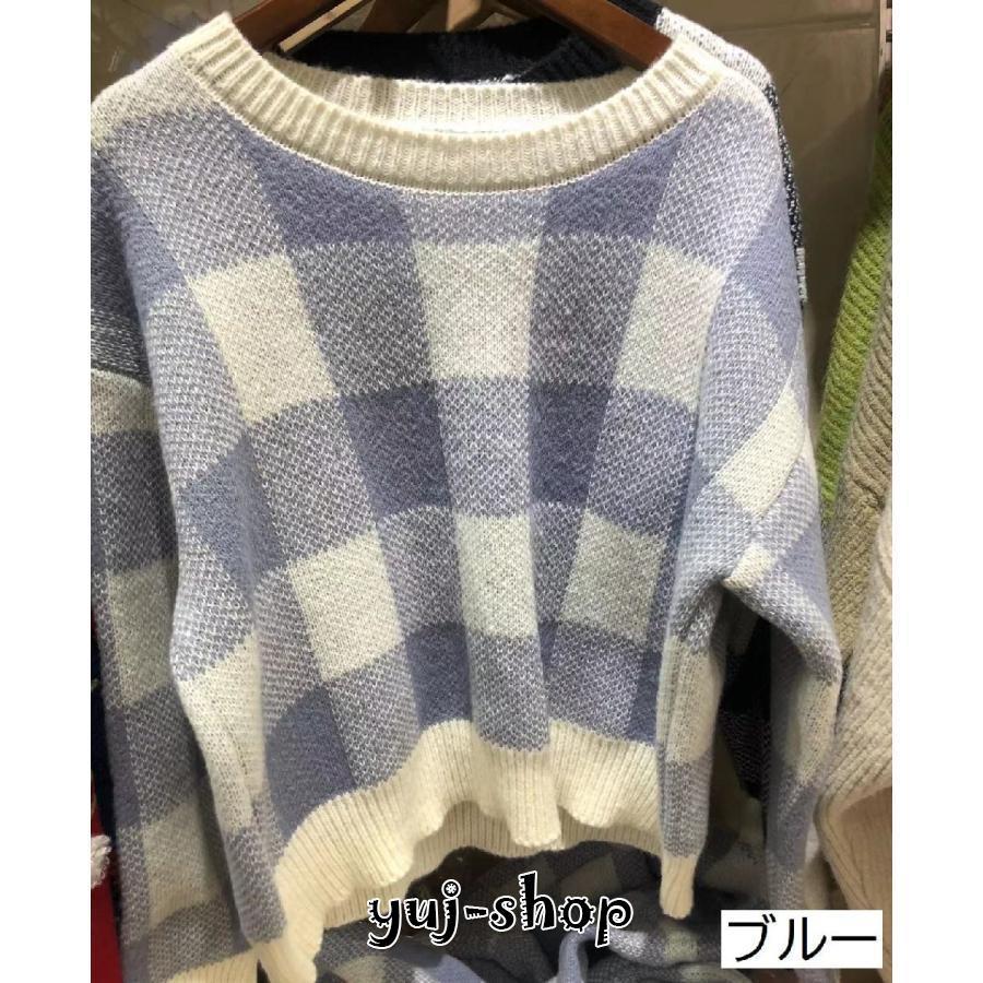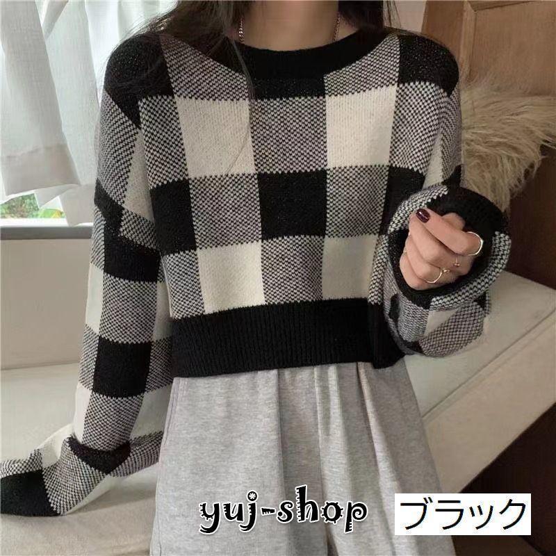ニット セーター レディース 女性用 トップス 長袖 クルーネック チェック 短め丈 ショート丈 おしゃれ カジュアル 可愛い シンプル 暖かい あっ