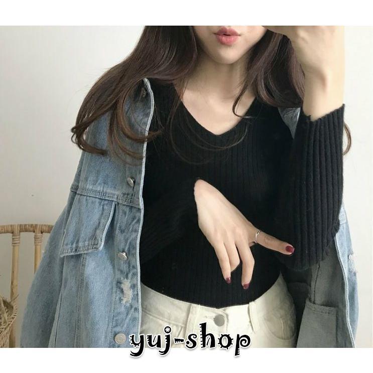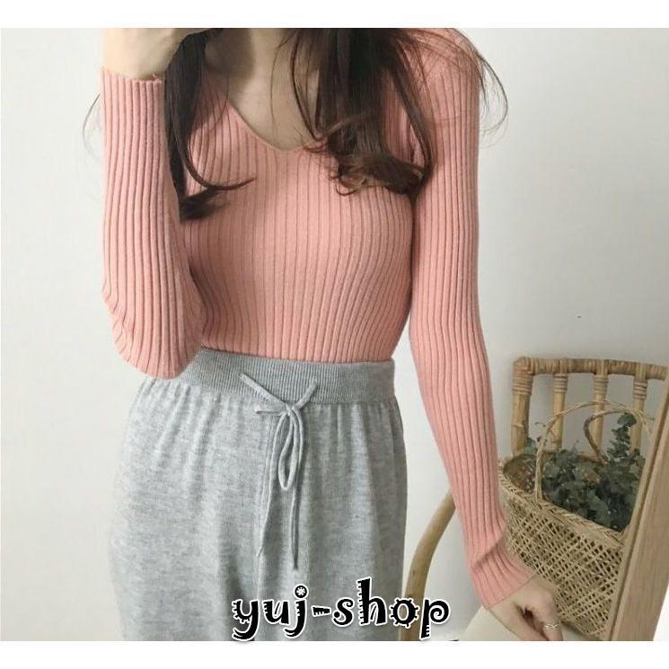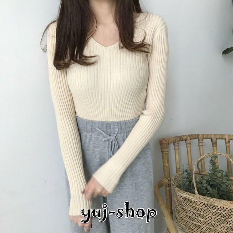 リブニット セーター レディース 女性 婦人服 トップス Vネック リブ 単色 フィット シンプル おしゃれ 着回し デイリー 普段着