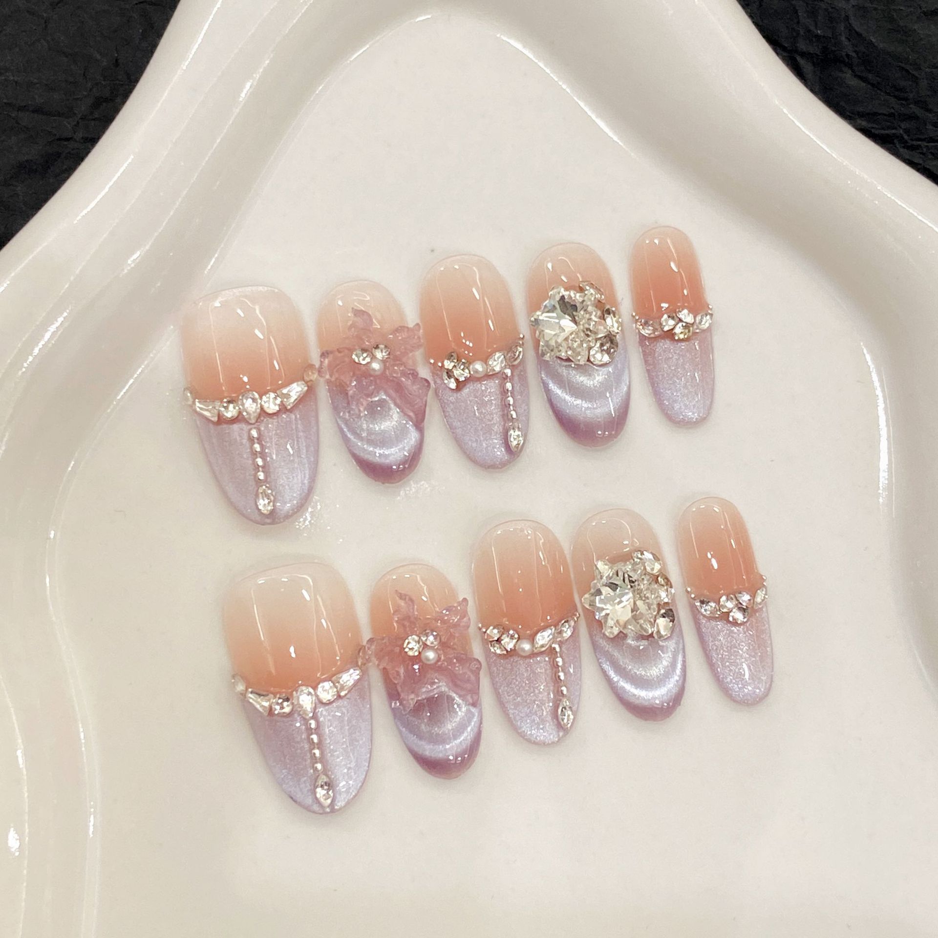 オリジナルホワイトニングパープルキャットアイフレンチダイヤモンドアイスフラワーネイルアートハンドウェアリングネイル