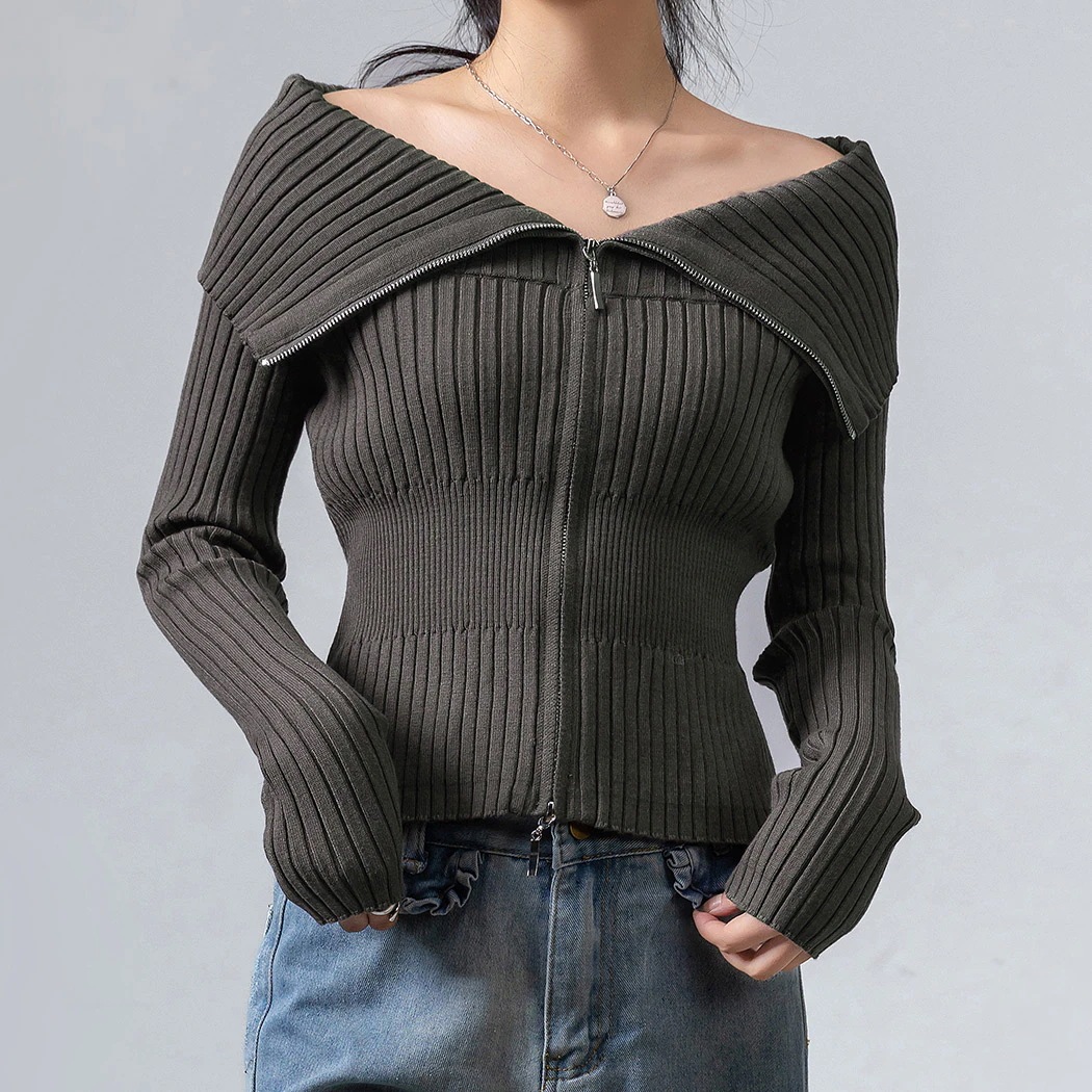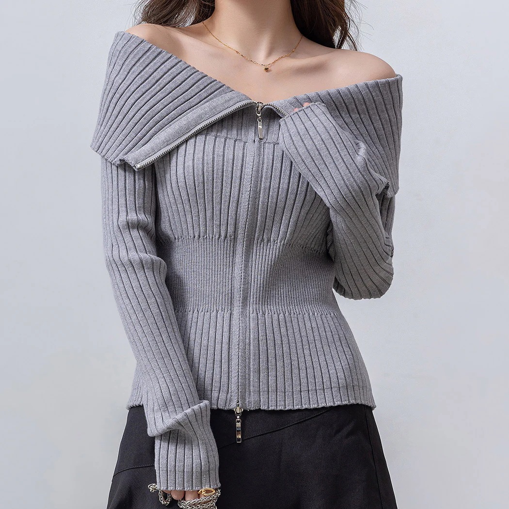 ニット セーター トップス カーディガン アウター 長袖 レディース ビッグカラー 折り返し 小顔効果 オフショルダー 春秋 白 黒
