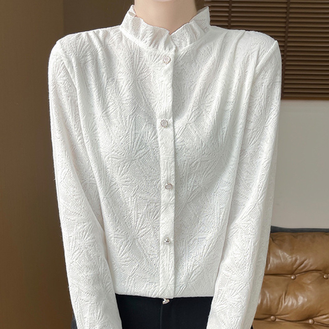 レディース ニットブラウス 透かし編み トップス きれいめ フリルネック スタンドカラー フリル