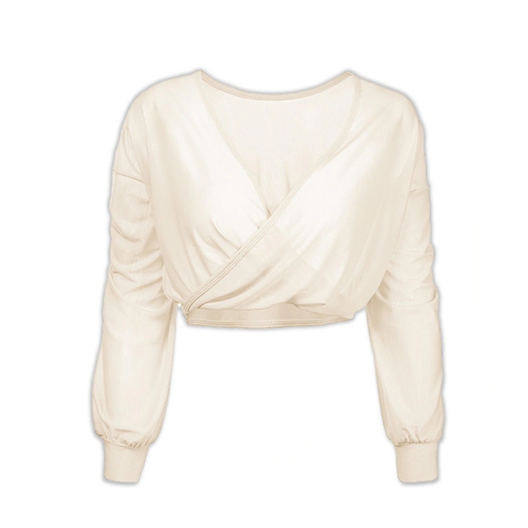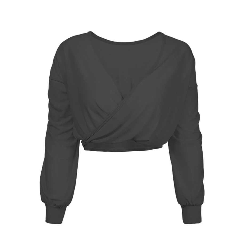 ヨガウェア トップス 長袖 レディース Uネック カシュクール 前後2way クロップド丈 メッシュ生地 プルオーバー タックカフス 黒