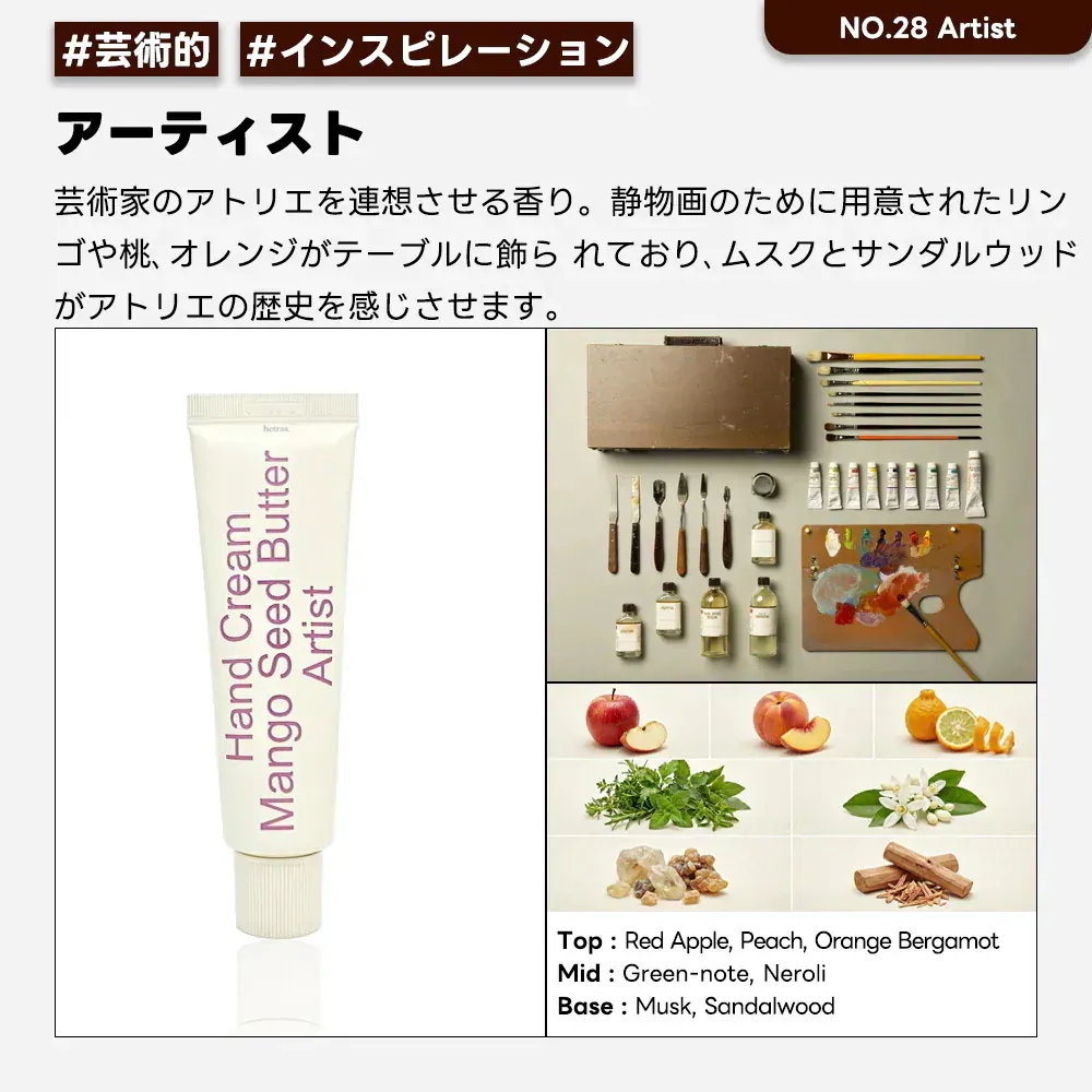以前、聖水店でBombshellの香り購入して使用してます。しっかり保湿してくれて香りの持続もまあまあ良くて大好きなハンドクリーム!今回はArtistを購入してみました!Artistなだけに個性的な香りかと思いきや!万人受けするフローラル系!デパコスの香水の香りにありそう!イメージはmiss diorの様な?って、勝手に思いました!でもそれよりムスクがよりきいてる感じで、個人的には清楚さの中に大人っぽさも感じられて春に似合う香りだと思います!今回のハンドクリーム購入して思ったのですが、たぶんどれにしても外れない香りのハンドクリームだと思います!また違う香りも試したい!!